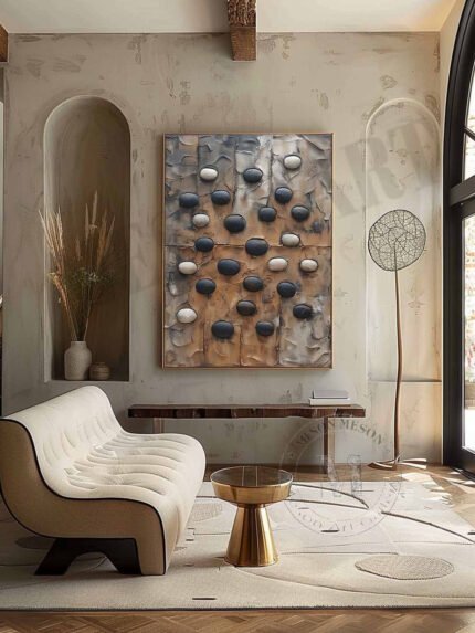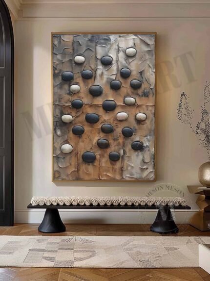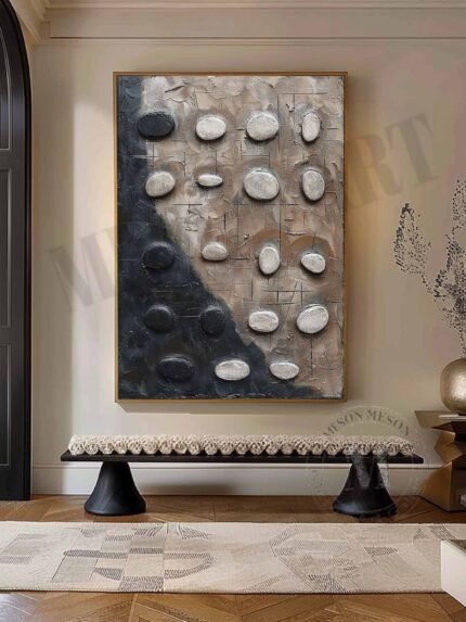 Earthen Equilibrium: Wabi Sabi Textured Painting with 3D Black and White Stones
