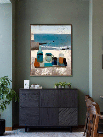Coastal Repose: Rustic Textured Ocean View Painting with Still Life for Kitchen Decor