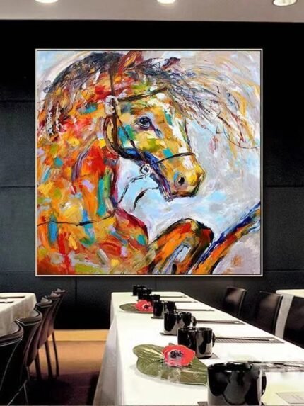 This beautiful painting is of a horse named ‘Secretariat.’ The horse is galloping with stunning force. Its many colors make