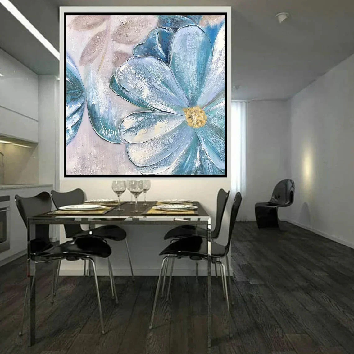 This artwork brings a gentle bloom to life with textured petals and calming blue tones. A timeless reminder of nature’s serene beauty, it radiates tranquility and grace. Perfect for enhancing any space, it offers a blend of sophistication and calm.