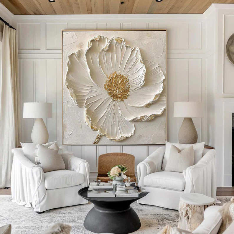 A soft ivory bloom opens across the canvas, its golden center glowing with quiet warmth. The textured petals feel alive, as if they’re gently unfolding in the room. This painting brings a calm, uplifting presence, like a peaceful moment in nature held in place.