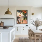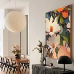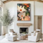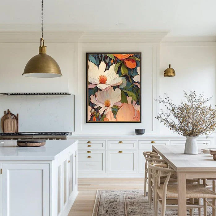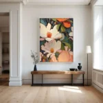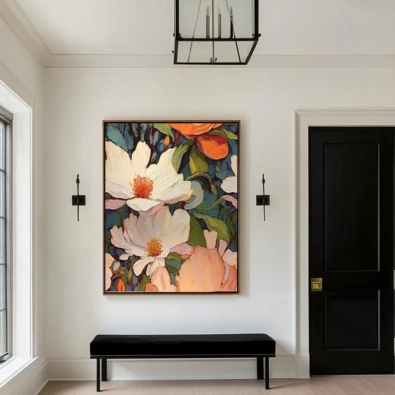 “Anemora” feels like sunlight captured in paint. The soft peach tones blend with fresh green colors and deep blue shadows. The gentle brushwork really brings the flowers to life. It adds calm beauty to any room and gives your space a warm, inviting glow that feels both modern and natural.