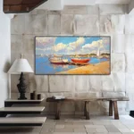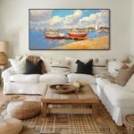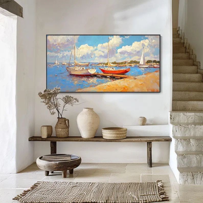 Inspired by the quaint little harbor town of Antibes in France, this piece brings lovely vibes to your home! The red boat creates a beautiful contrast underneath the beautiful blue sky, making this piece a rich, and vibrant addition to any home interior!