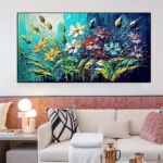 This painting feels like looking at a bright garden underwater. The cool blue background sets a calm scene while the textured flowers burst with warm color. The thick strokes give the artwork a joyful spark. It brings freshness, light and a lively mood to any room.