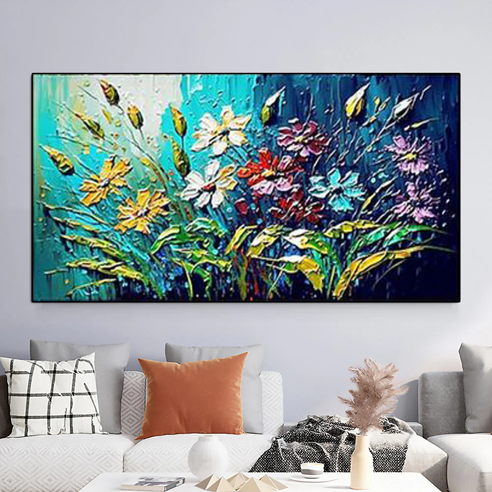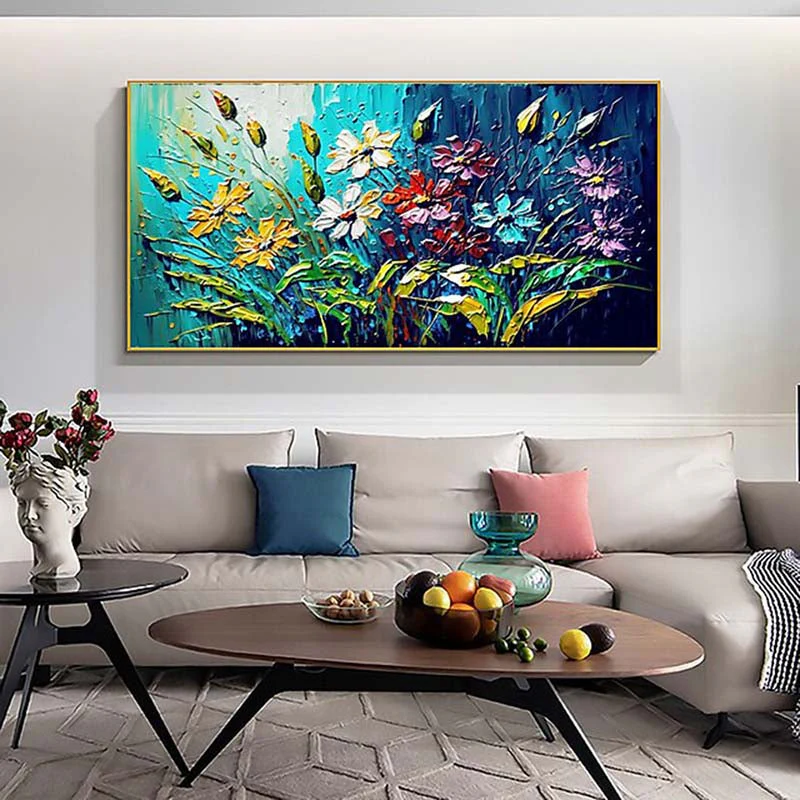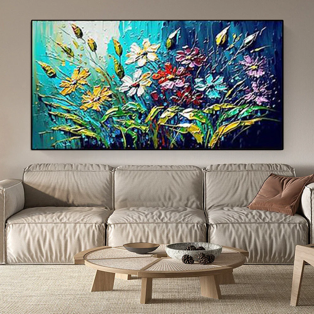 This painting feels like looking at a bright garden underwater. The cool blue background sets a calm scene while the textured flowers burst with warm color. The thick strokes give the artwork a joyful spark. It brings freshness, light and a lively mood to any room.