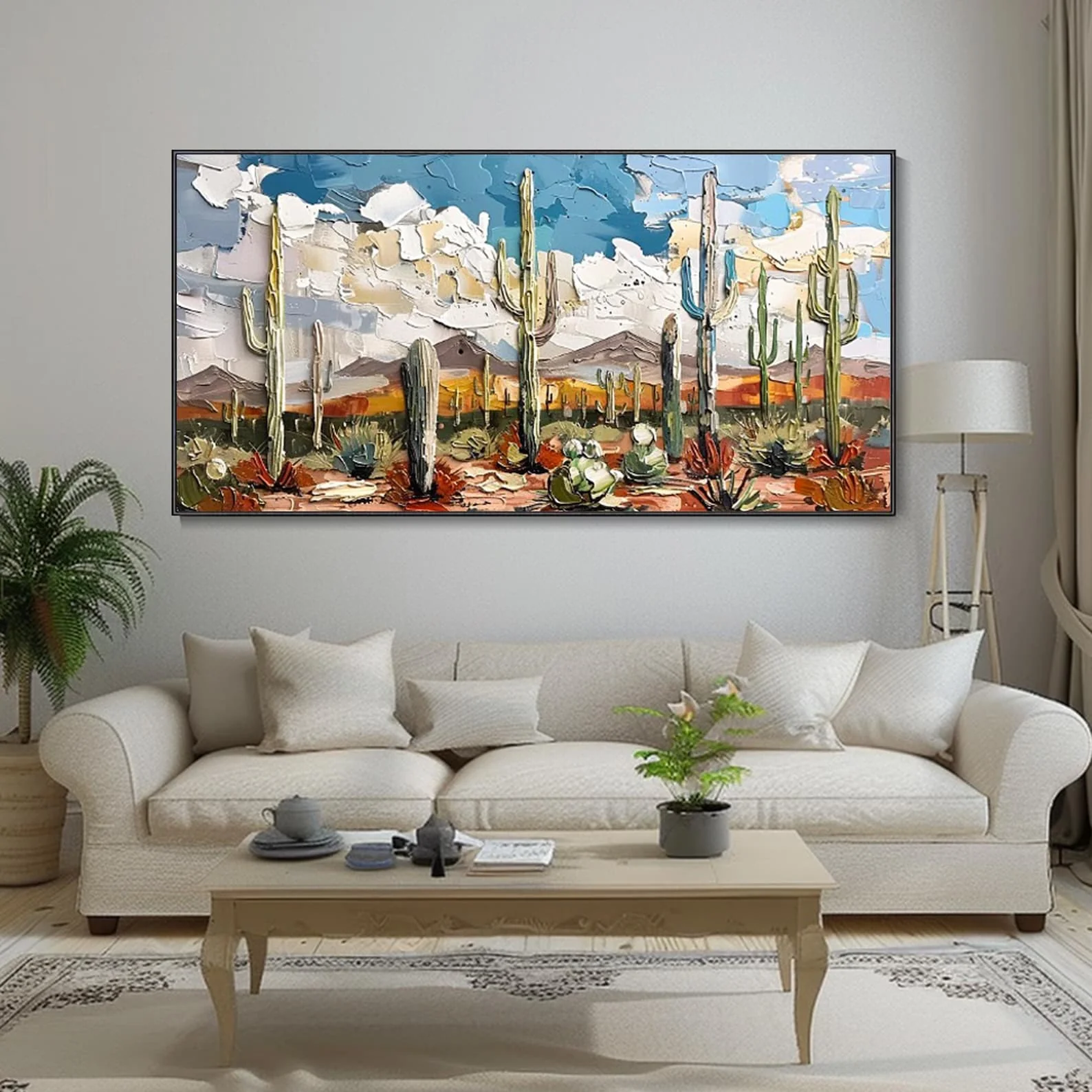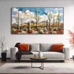 Arizona shows the desert as it truly is, full of warmth, calm, and power! The clouds, the cacti, the land that never sleeps. It’s a tribute to a place where colors clash and everything stands still yet alive. This painting brings the bold energy of Arizona right into your home!