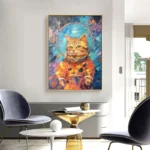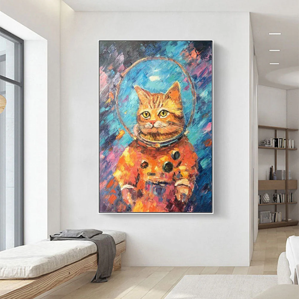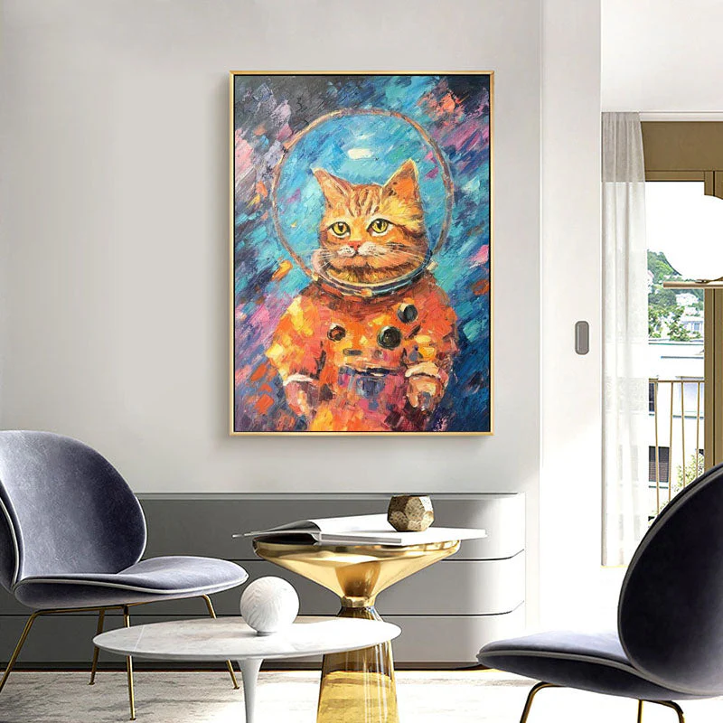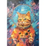 Astro Feline showcases an orange cat boldly going where no cat has gone before, in a full astronaut suit. This spacefaring feline is maybe searching the universe for some extraterrestrial fish! This lovely piece is a humorous and charming depiction of a cat’s adventurous spirit.