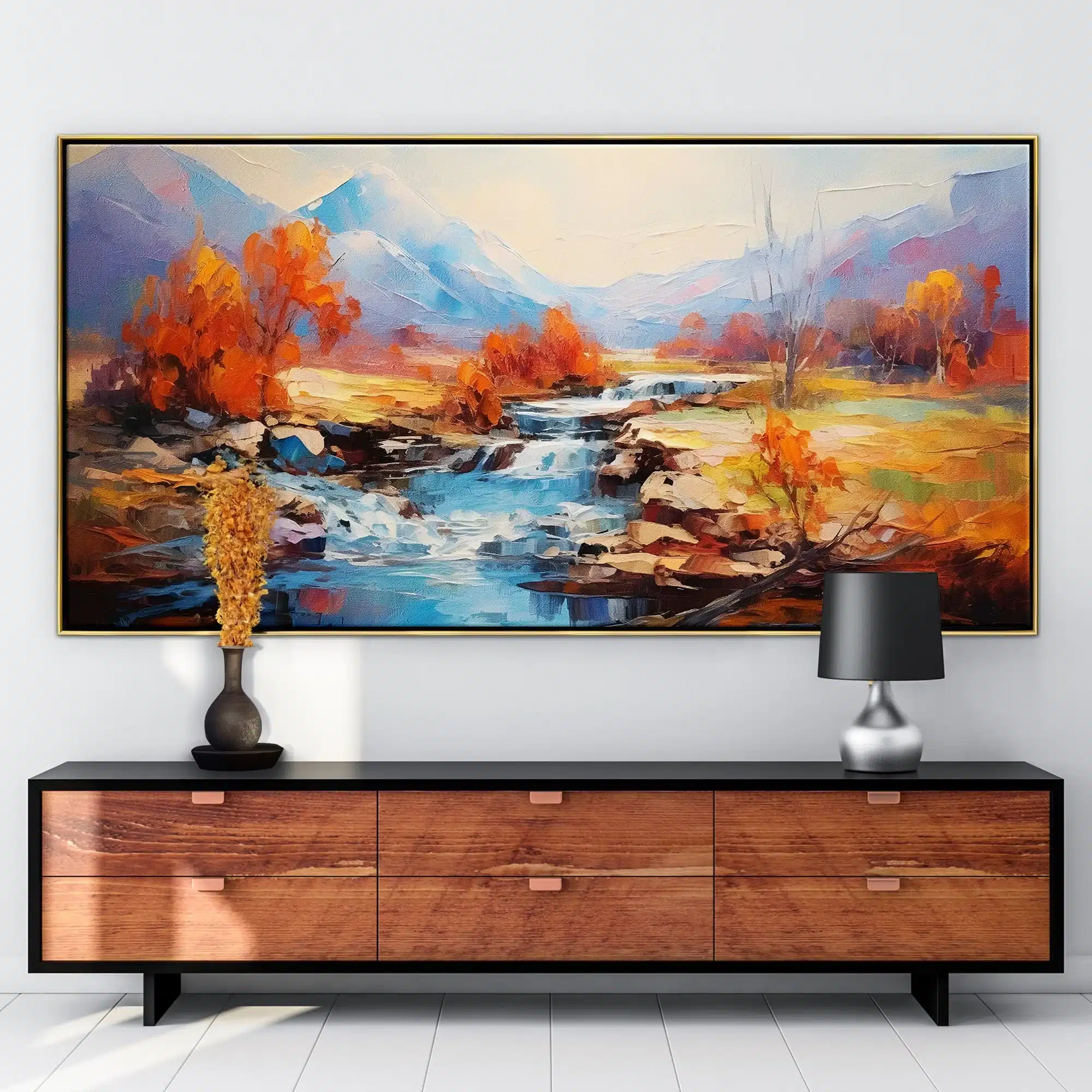 Experience the enchanting essence of autumn in this impressionist piece ‘Autumn Valley’. With vibrant brushwork, it paints a serene valley scene that warmly invites you to wander within its embrace, letting you immerse yourself in nature’s vivid beauty.