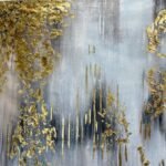 Golden leaves are falling down in a foggy landscape. This handmade painting beautifully composes the melancholic feeling of a rainy day in autumn.