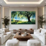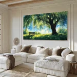 Beneath the Willow shows a quiet place where time seems to slow down. A wide willow spreads soft shade over a lonely bench. Sunlight dances through the leaves. This willow feels like a keeper of memories, offering rest, comfort, and calm to anyone who sits beneath its branches.