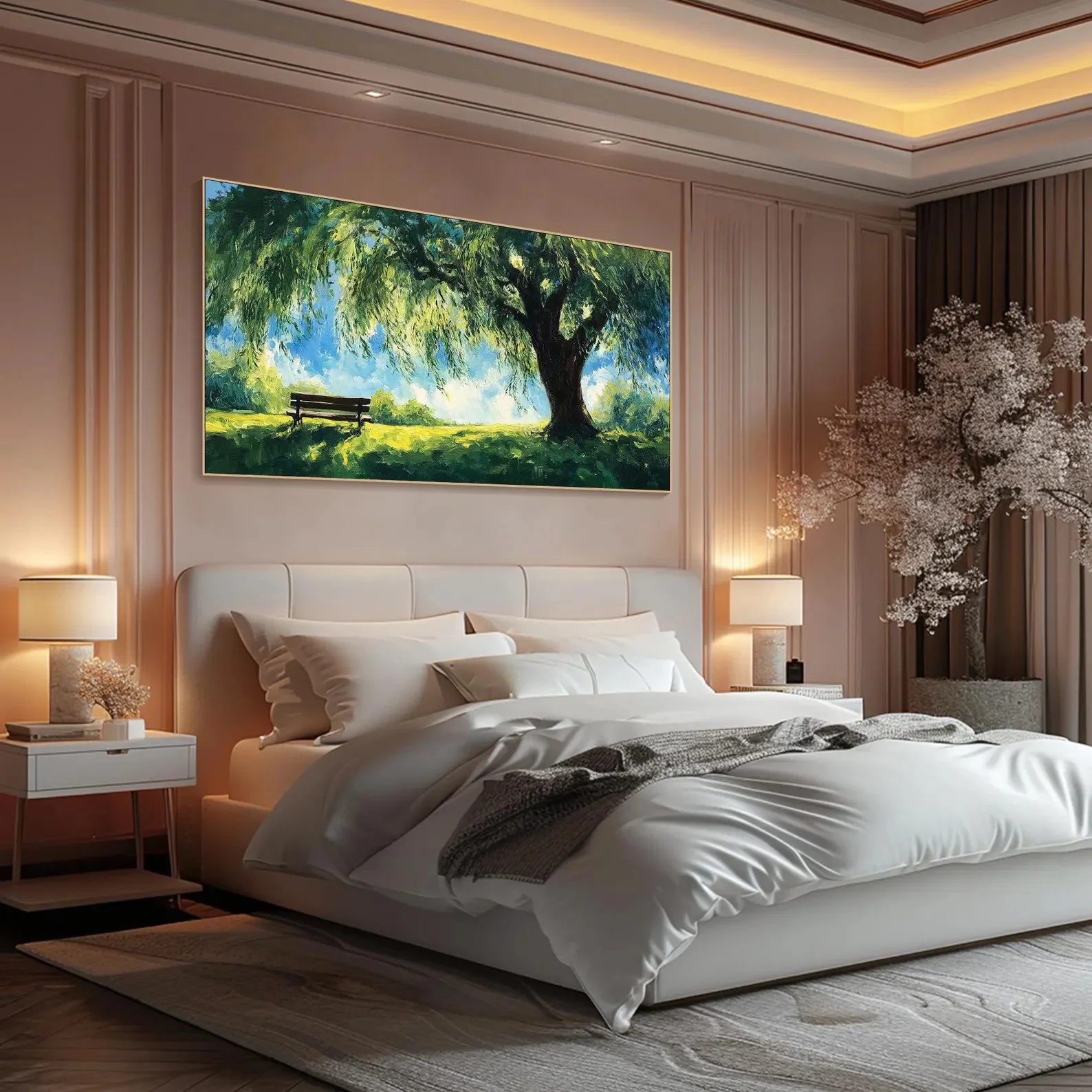 Beneath the Willow shows a quiet place where time seems to slow down. A wide willow spreads soft shade over a lonely bench. Sunlight dances through the leaves. This willow feels like a keeper of memories, offering rest, comfort, and calm to anyone who sits beneath its branches.