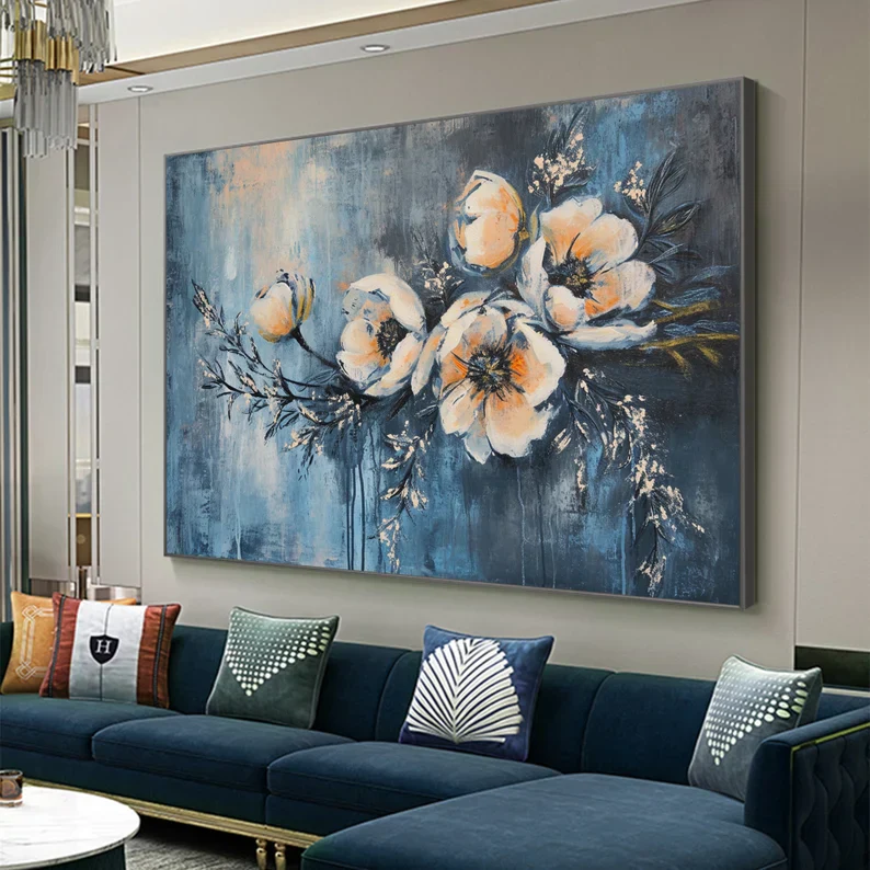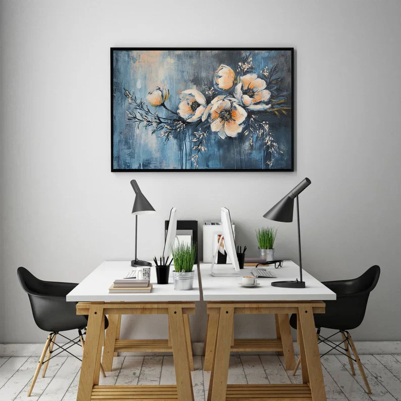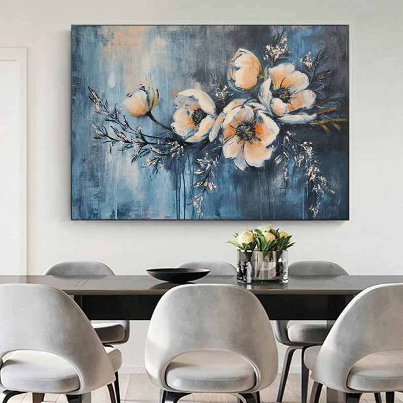 This art piece feels like a gentle celebration of flowers in full bloom. Soft cream petals float over a deep blue background. Loose brushstrokes give the flowers life and movement. Bloomist brings calm beauty and a fresh feeling, like a quiet garden moment captured on canvas!