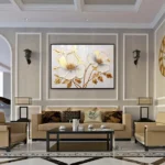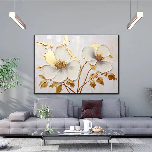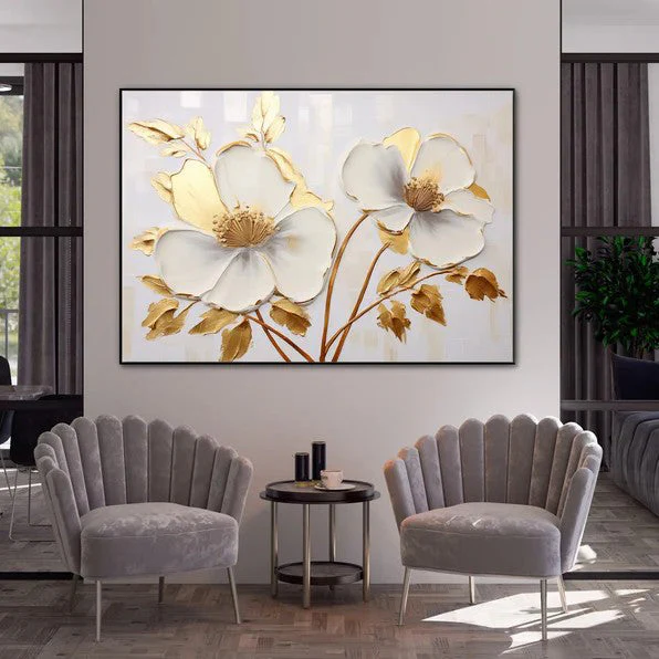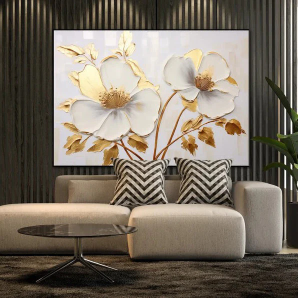 This amazing piece tells a story of flowers at their finest hour. White blooms open fully as gold details catch the light. The painting style feels soft and elegant with a dash of luxury. Blossomé brings calm beauty and a sense of care, lifting up every type of home interior!