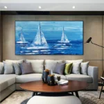 Meet ‘Blue Ocean Sailing,’ where three white sailboats waltz on a canvas of impressionistic blue. It’s like poetry in motion—waves and wind whispering tales of adventure. Let this painting transport you to a carefree nautical dreamscape.