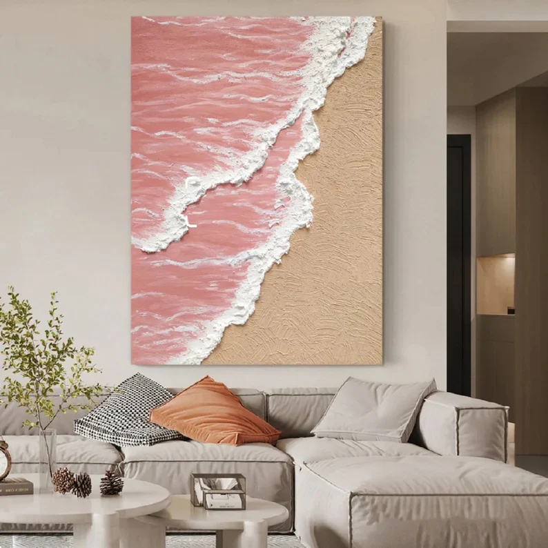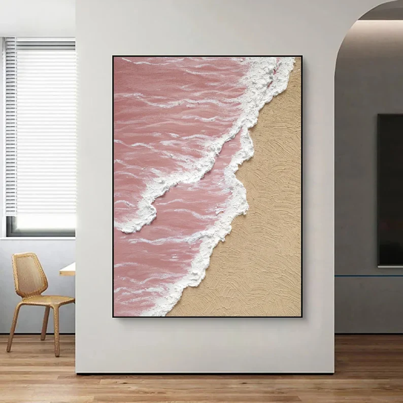 Looking at this artwork feels like watching waves roll in at sunset. Pink tones soften the scene while textured white lines add a sense of motion. The subtle painting style feels calm and light, filling your space with warmth and a gentle seaside feeling.