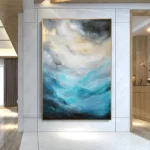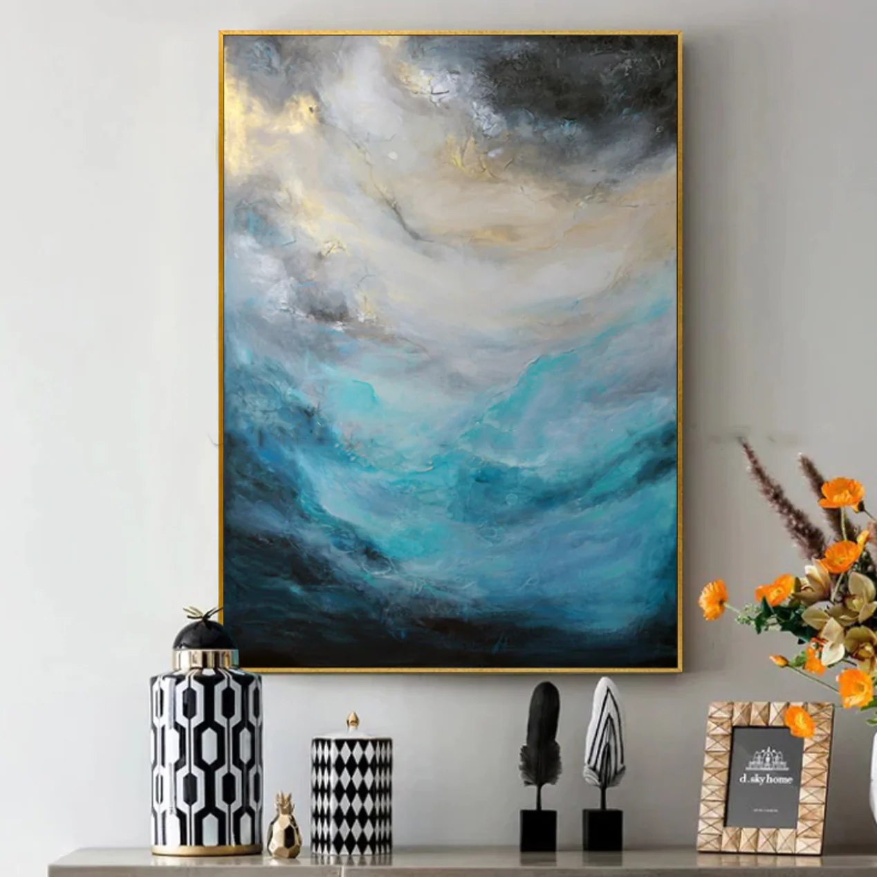The vivid blue colours spark energy and beautifully blend towards more mysterious-looking, darker colours, resembling a powerful ‘breeze’ at a stormy sea. Waves crashing violently under a dark sky, what a sight to behold. This painting really comes alive.