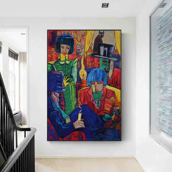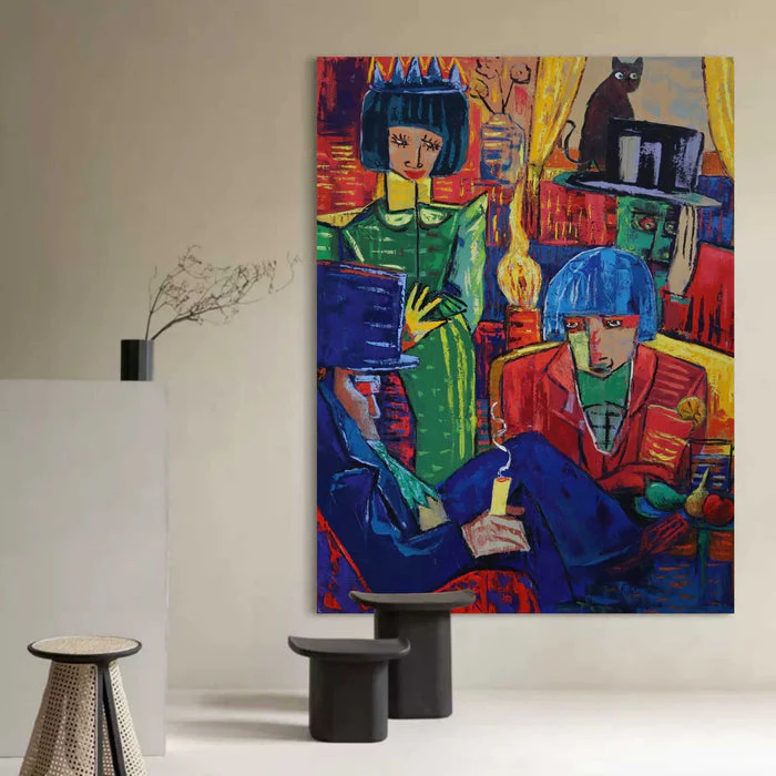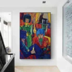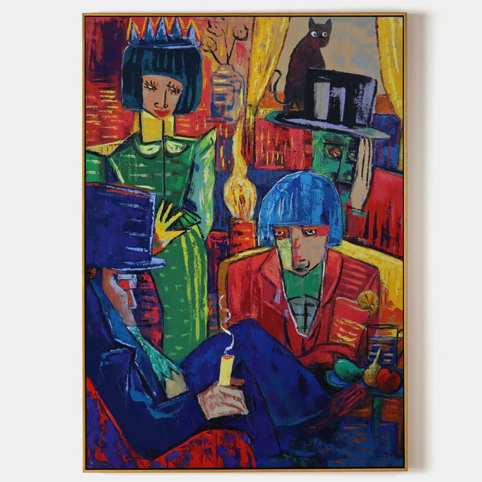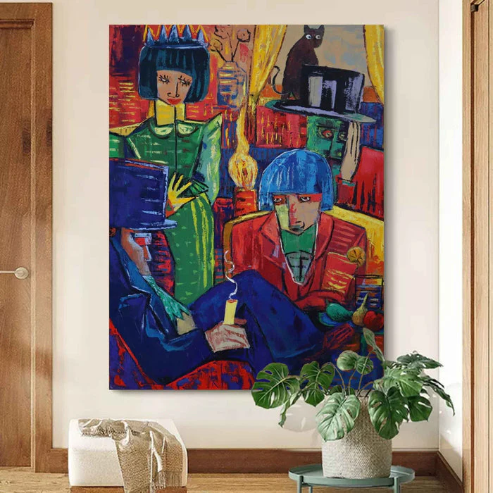 In this very interesting artwork, everyone seems busy, yet nobody agrees on what is happening. Papers, hats, and strange looks fly around. The unique, expressive style feels both bold and humorous. Business Meeting brings color, fun, and a light hearted take on work life into your spaces!