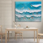 Catching Waves feels like watching a perfect beach day unfold from the sky. Surfers and swimmers move gently through sculpted waves, while the textured paint adds depth and motion. This summery piece brings calm joy and playful balance to any type of home interior!