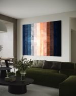 Elevate your interior with the sophisticated rhythm of “Chromatic Strata.” This stunning abstract artwork is a modern symphony of color, presenting a curated palette of rich, earthy, and oceanic tones in a clean, structured format. It is a piece that speaks of balance and harmony, where the cool tranquility of deep blues meets the grounding warmth of terracotta earth. It brings a sense of calm, order, and high-end design to your space.