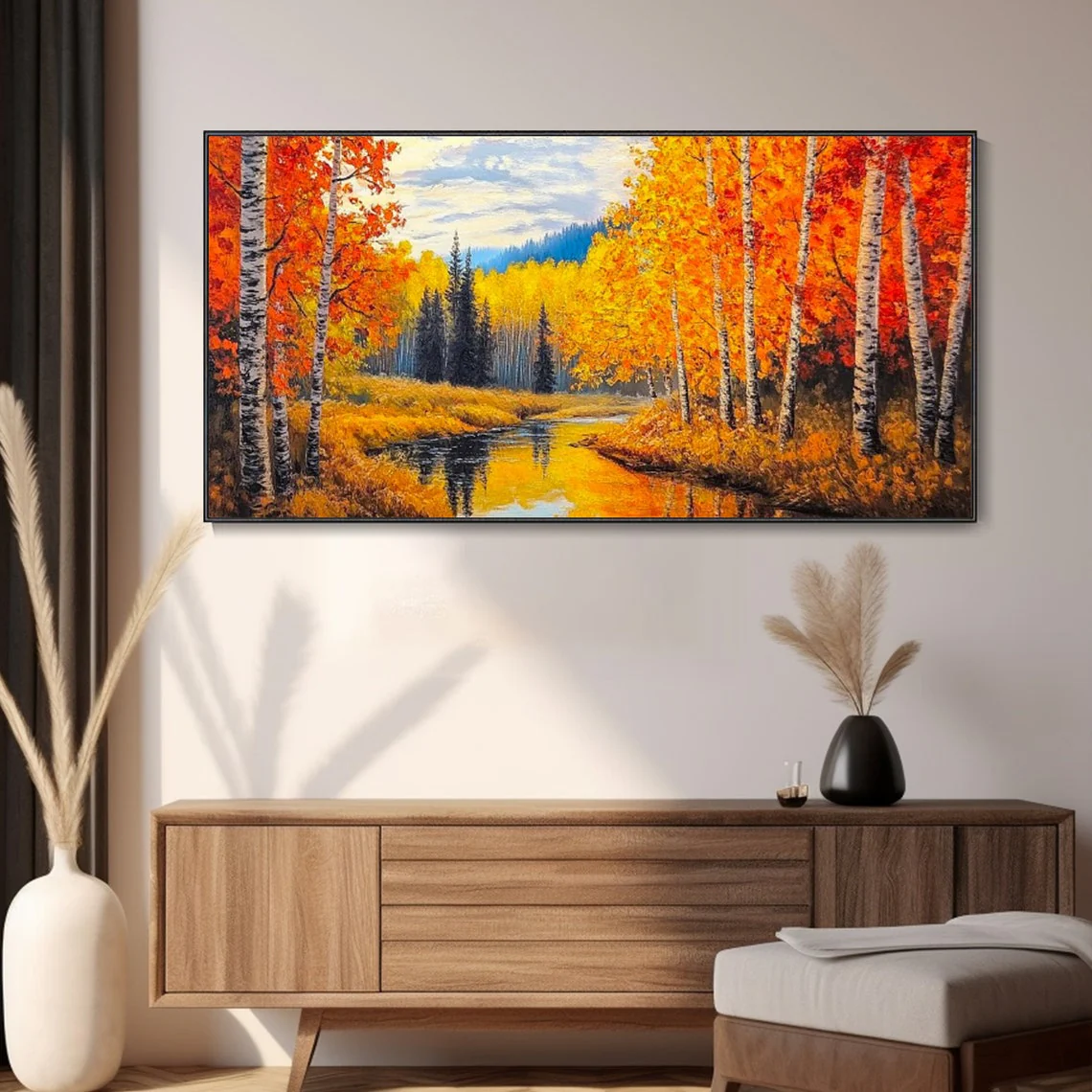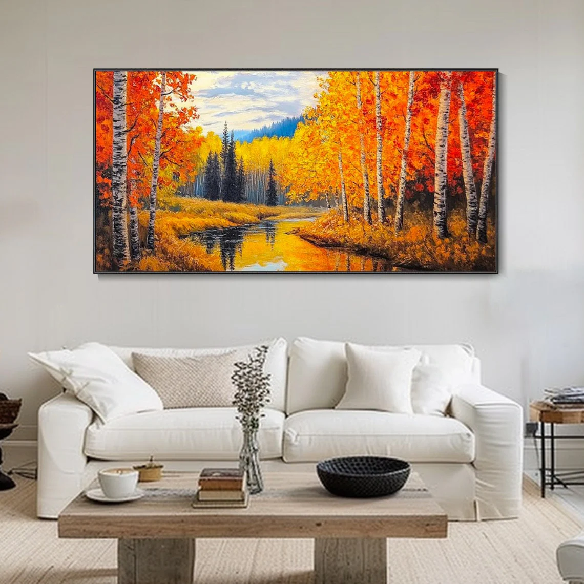 This piece shows the magic of autumn in the real Colorado highlands. Golden forests stand tall beside clear water that softly reflects the sky. Let this vibrant painting bring fresh air into your room, making the space feel peaceful, open, and gently alive
