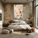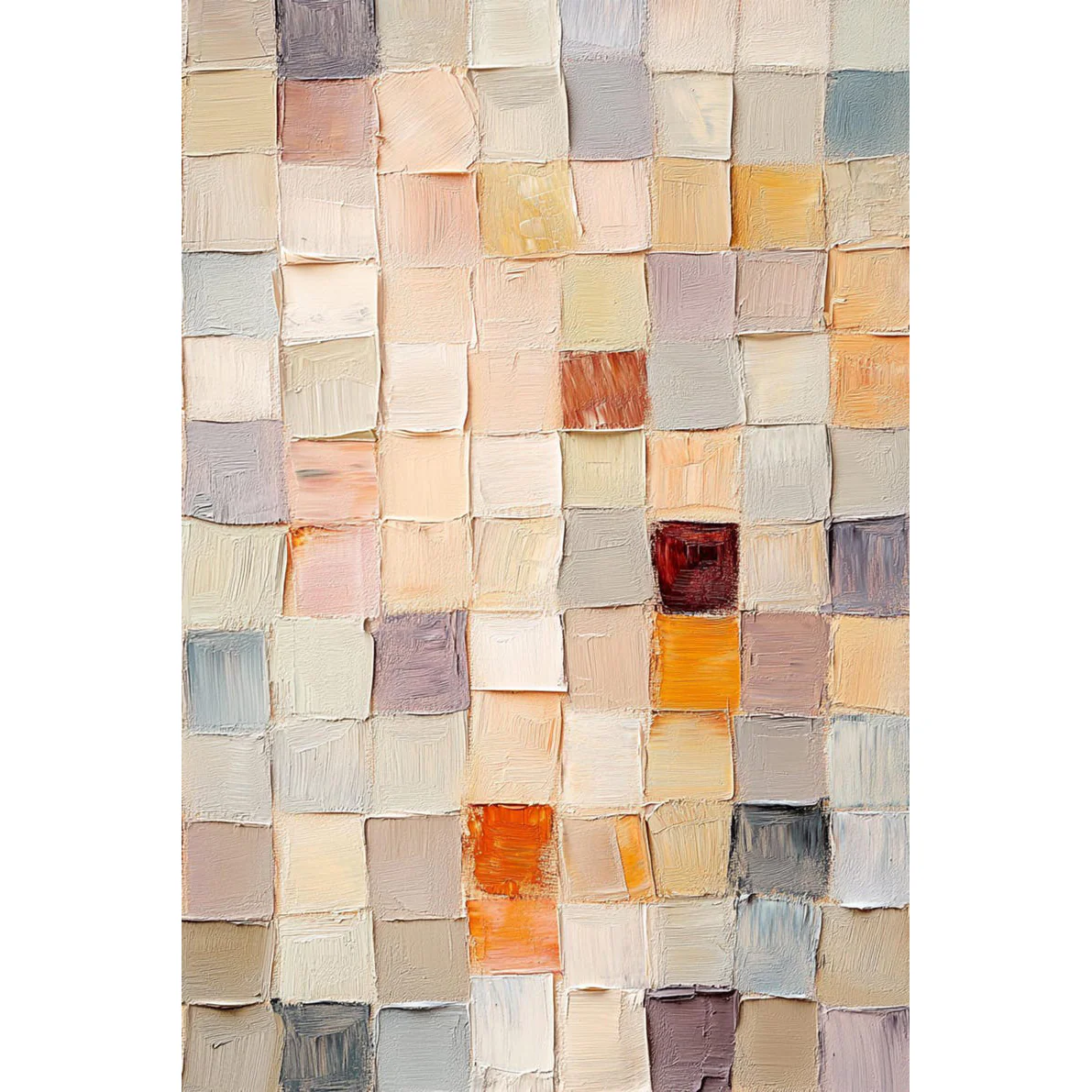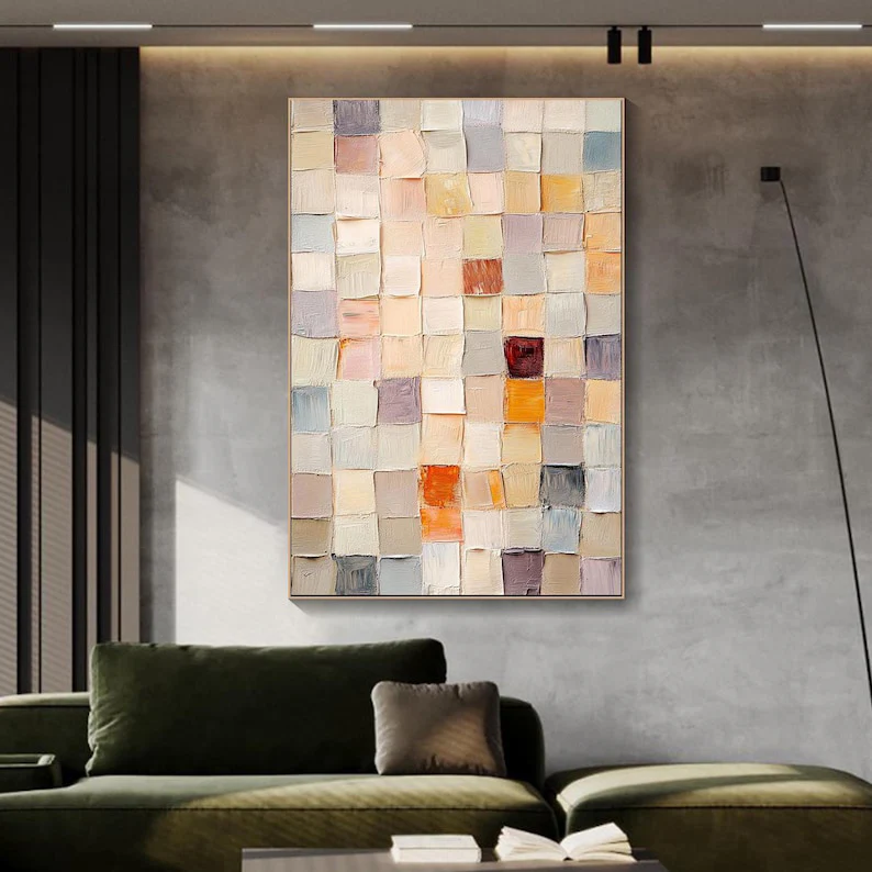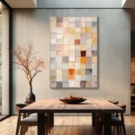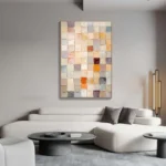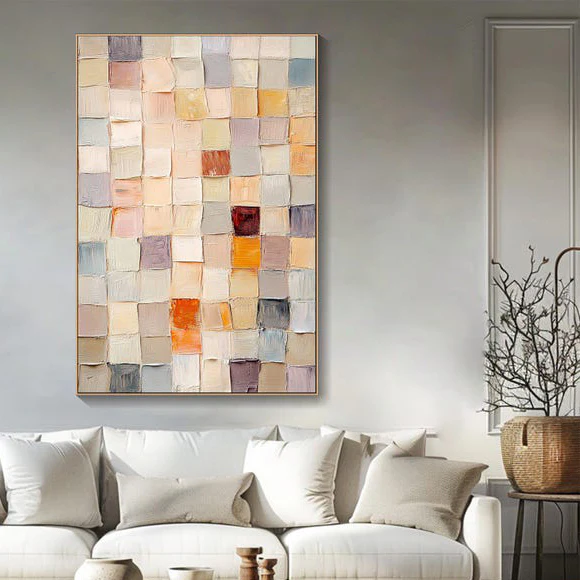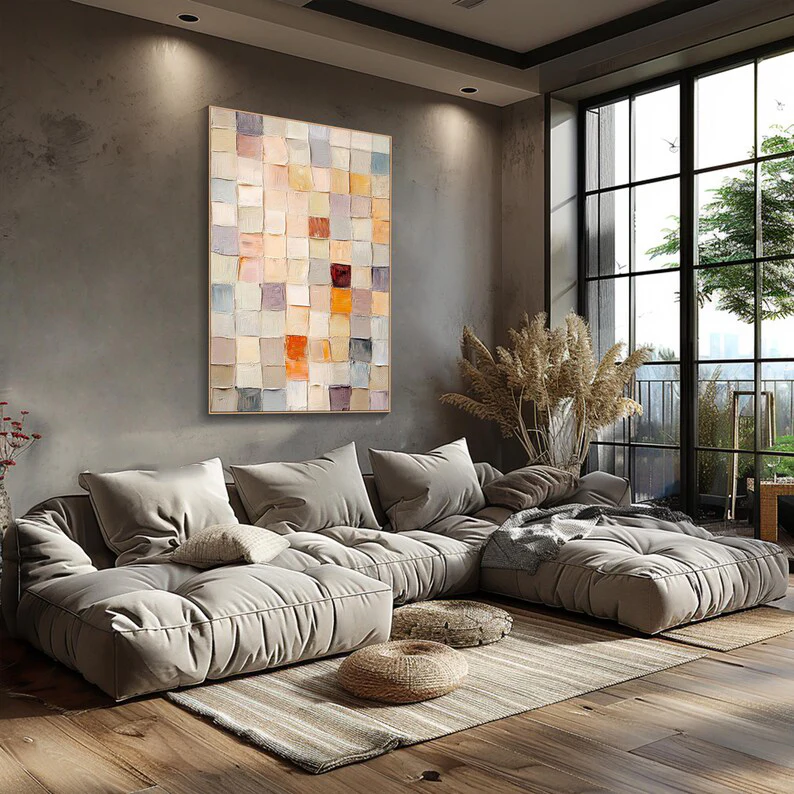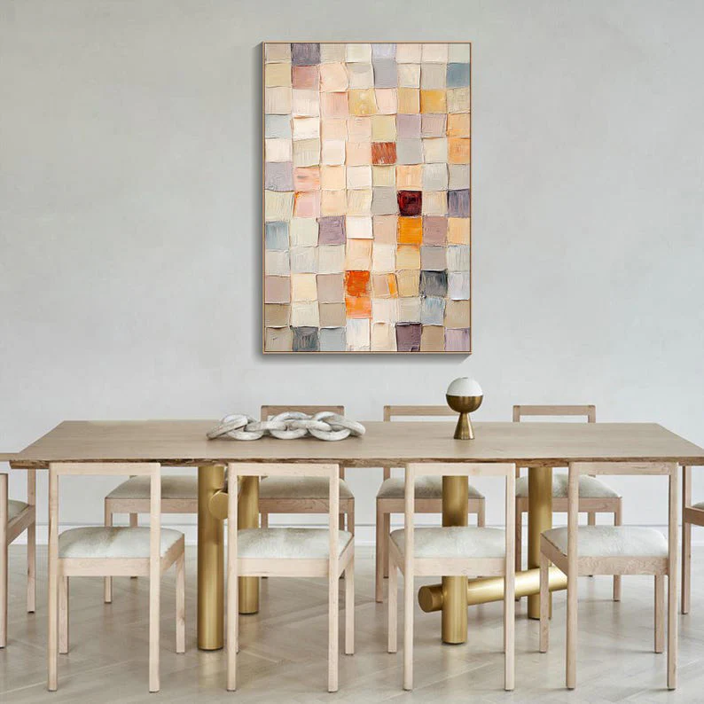 The painting feels steady and soothing, like colors finding their perfect places. Each block supports the next, creating a soft visual rhythm. It helps the room feel grounded and calm, making the space feel carefully composed.