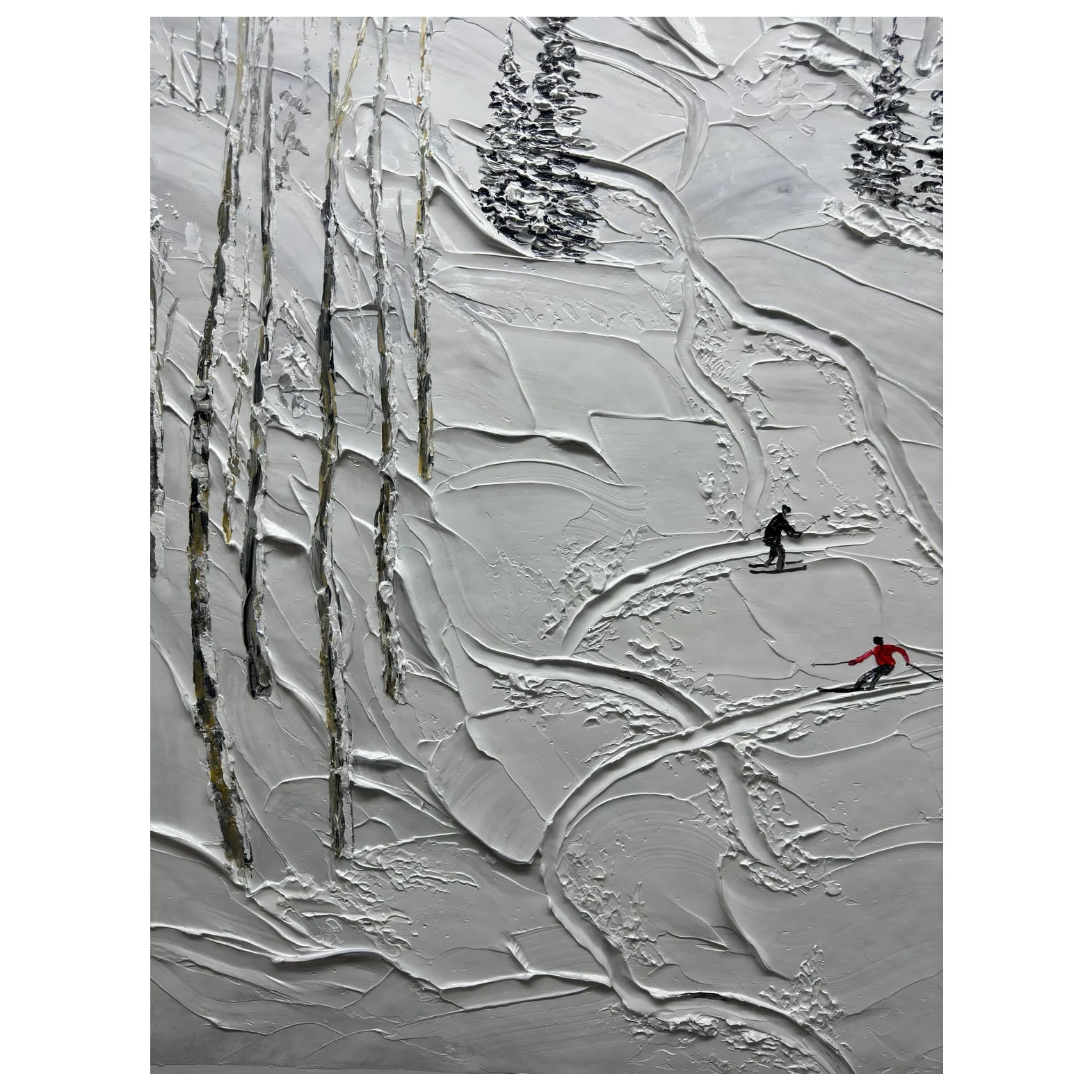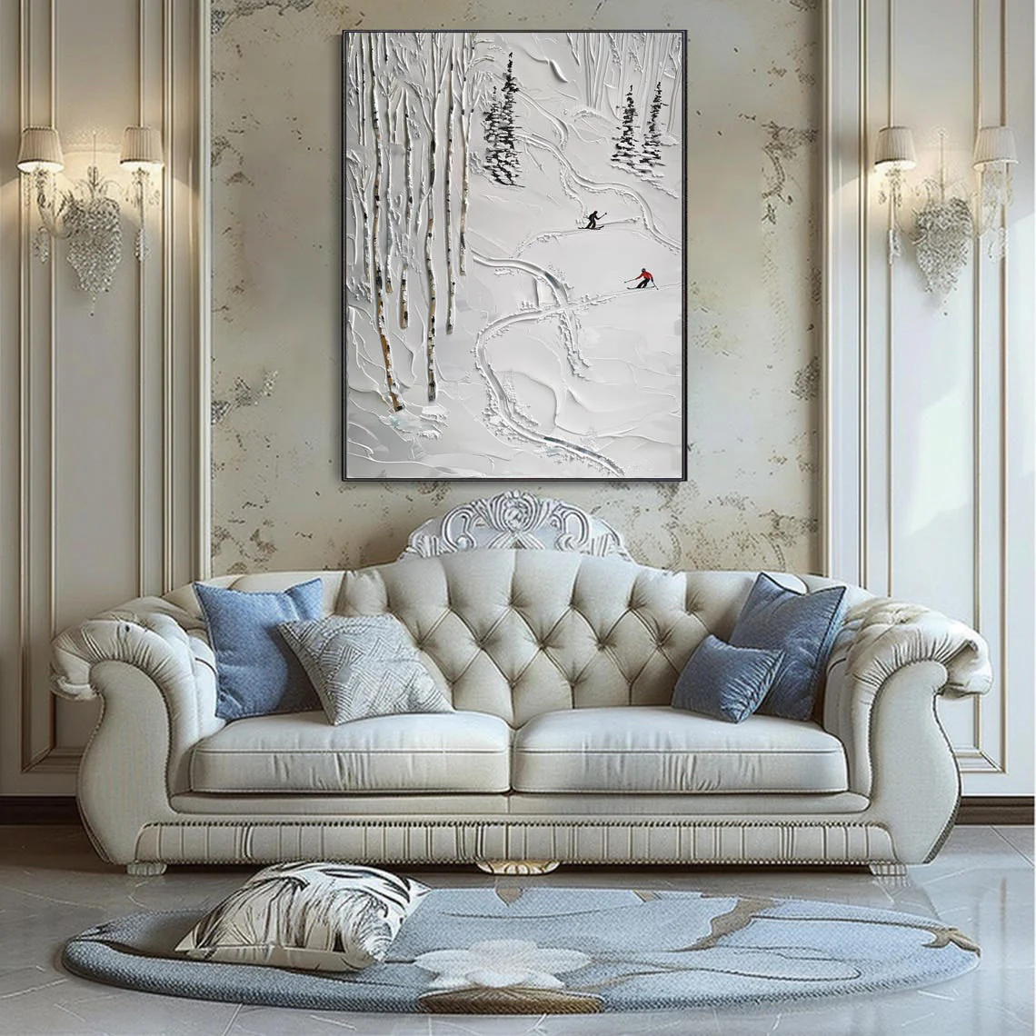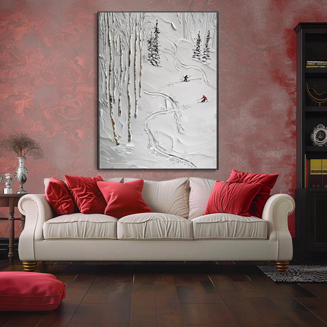 This artwork stands out through its sculpted surface and impressive knife work. The snowy scene feels dynamic, almost like a map of motion and paths. It brings freshness and playful calm into the room, offering a gentle, snowy escape for any home interior!