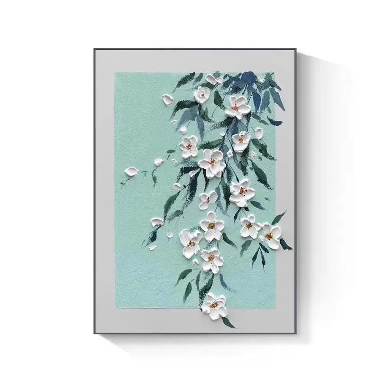 This beautiful artwork feels light and calm, like flowers drifting through a soft morning breeze. The raised texture gives the blossoms a gentle, almost sculpted look. Dreamy petals brings freshness and quiet joy into the room, making your space feel peaceful and alive.
