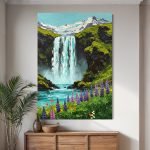 Escape to a world of pristine, untamed beauty with “Eden’s Cascade.” This breathtaking painting captures a perfect moment in a secluded mountain paradise, where a powerful waterfall thunders down from snowy peaks into a crystal-clear river. In the foreground, a riot of colorful wildflowers blooms with joyful abandon. It is a vibrant celebration of nature in its purest and most majestic form, a piece that will fill your space with life, energy, and a sense of awe.