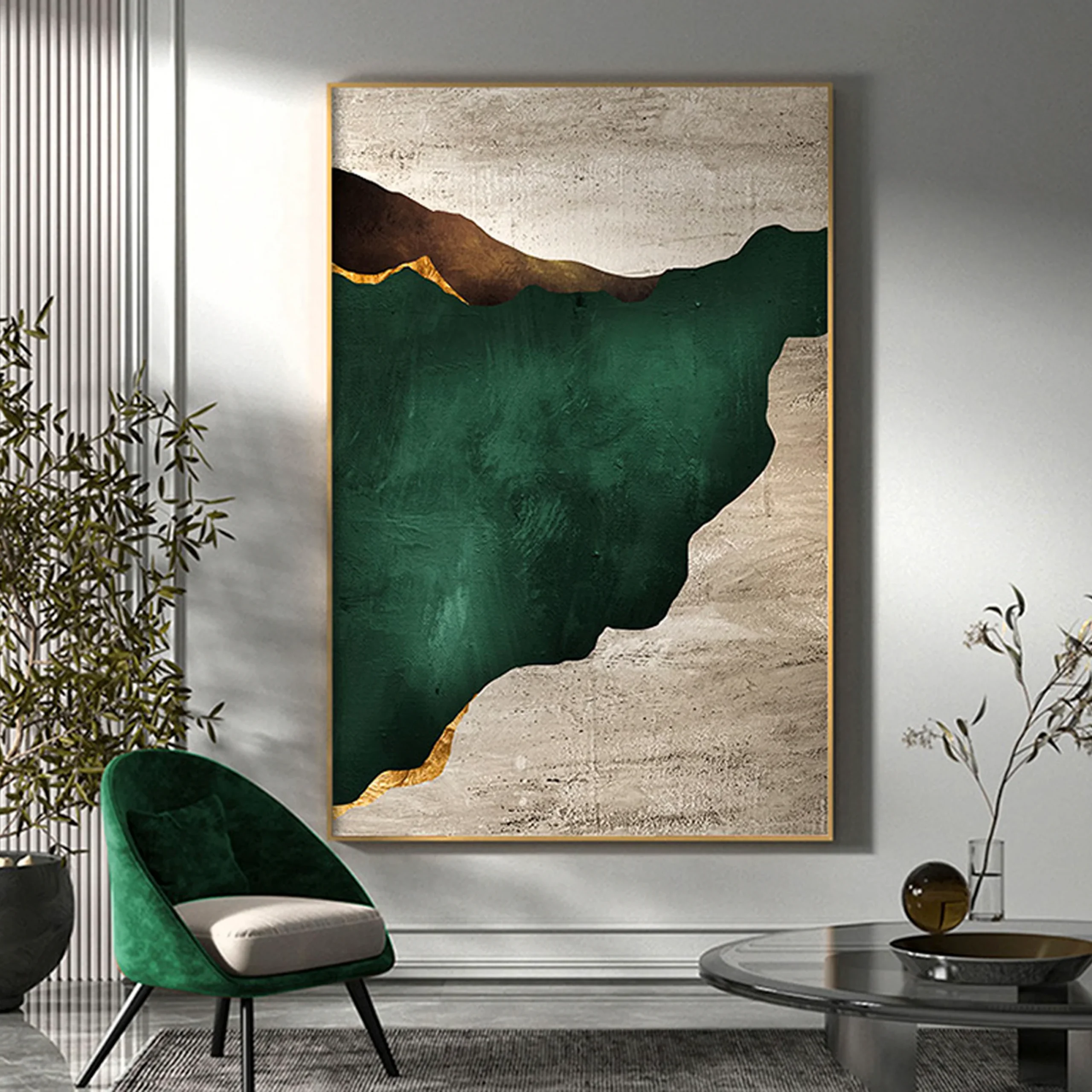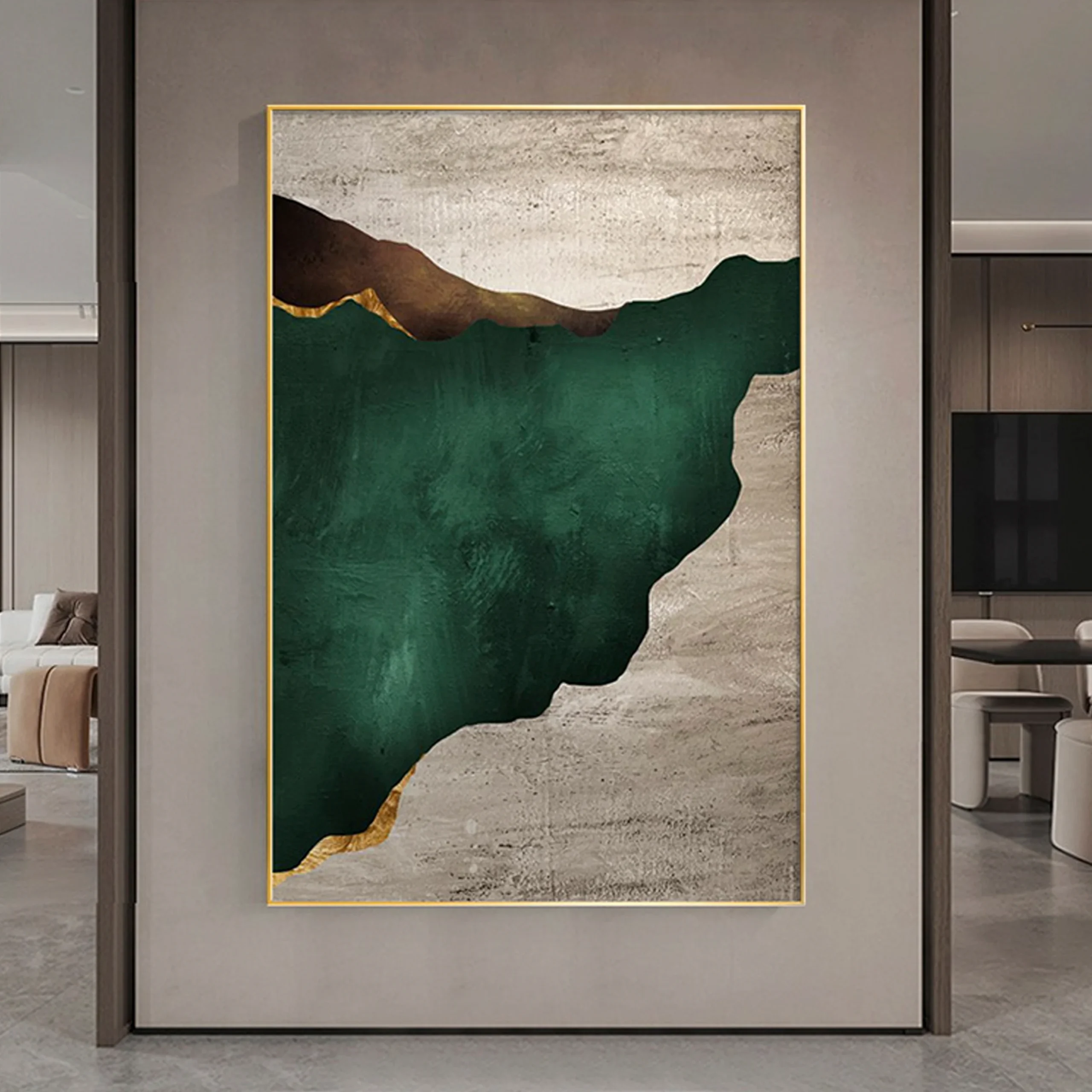 After years and years of hard pressure, beautiful emerald rocks emerge. This fantastic artwork shows the beauty of nature’s gemstones with a modern twist to it. Its soft and subtle colors make this painting suited for any home interior! â�