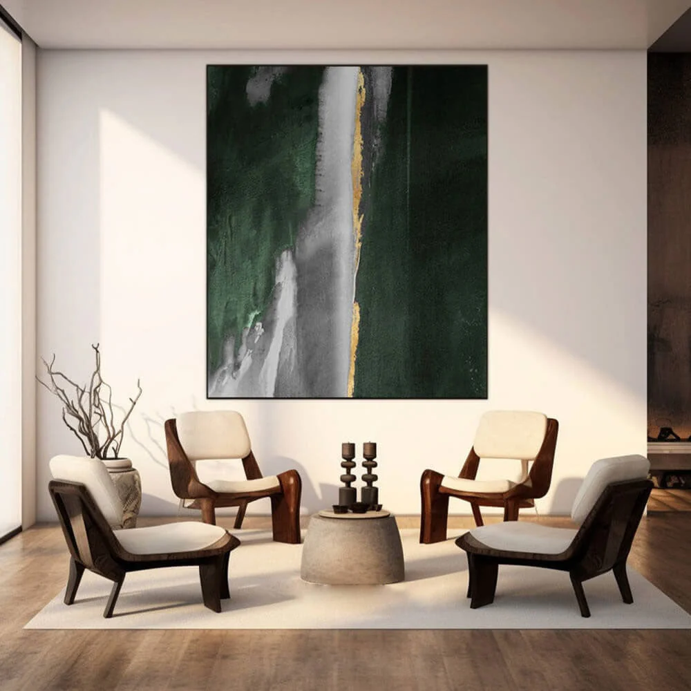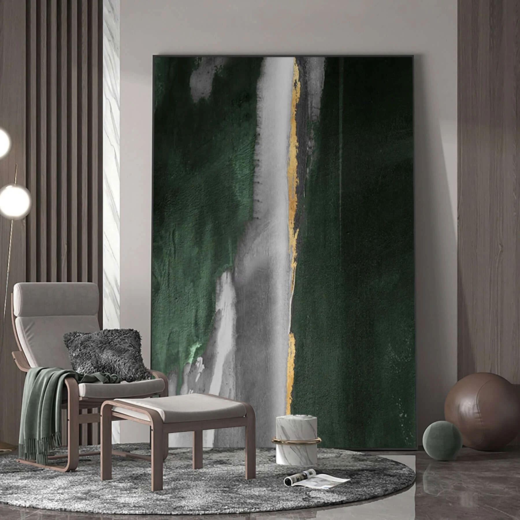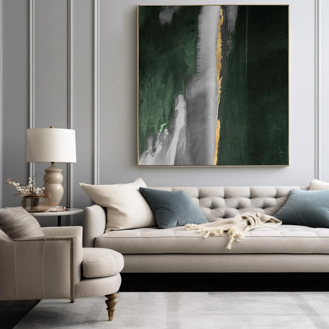 Emerald’ is a beautiful abstract artwork with deep greens, soft grays, and shimmering gold accents. It captures the beauty of nature and adds elegance to any room. This stunning piece will bring vibrant energy and sophisticated charm to your home.â�