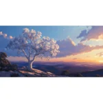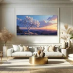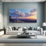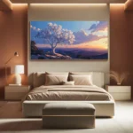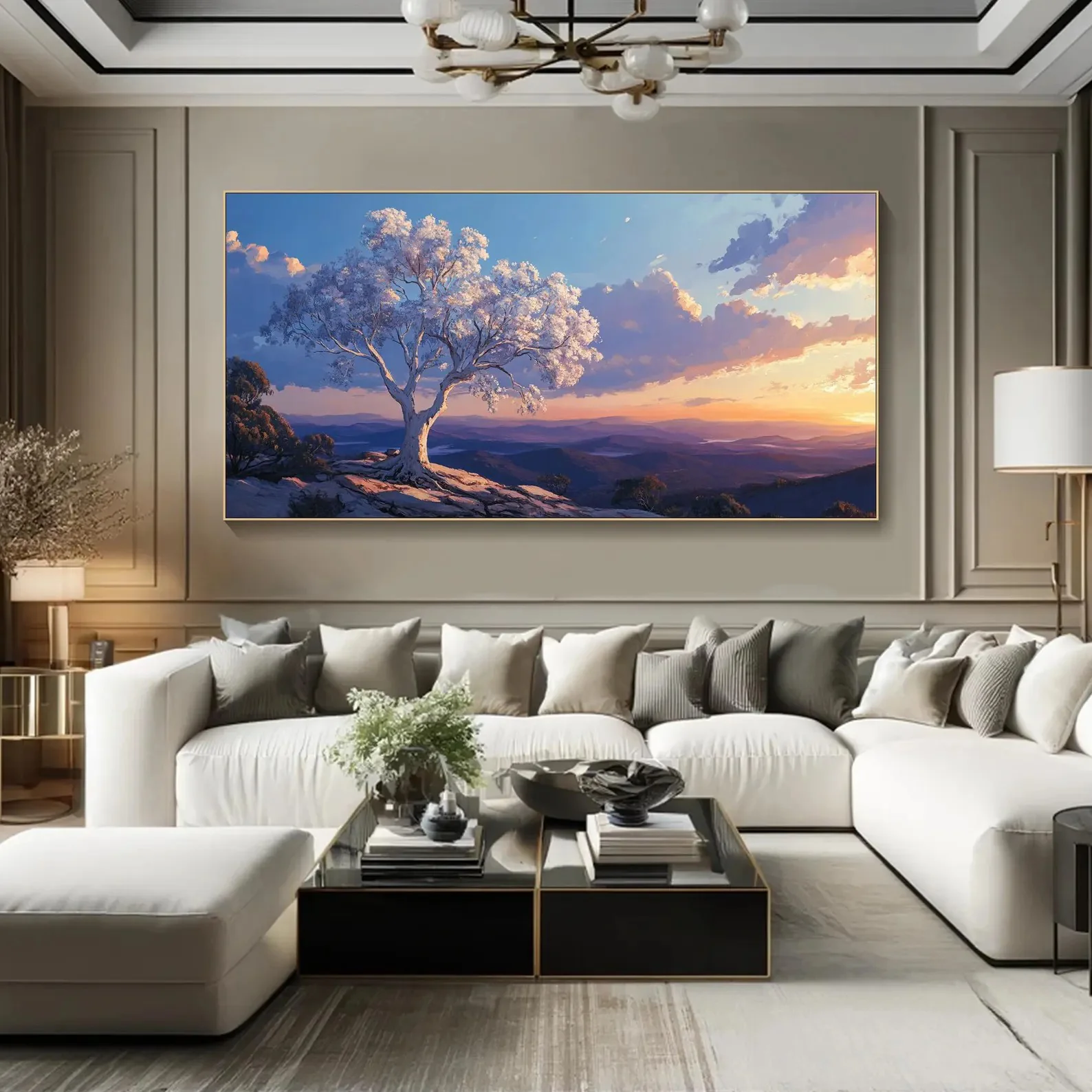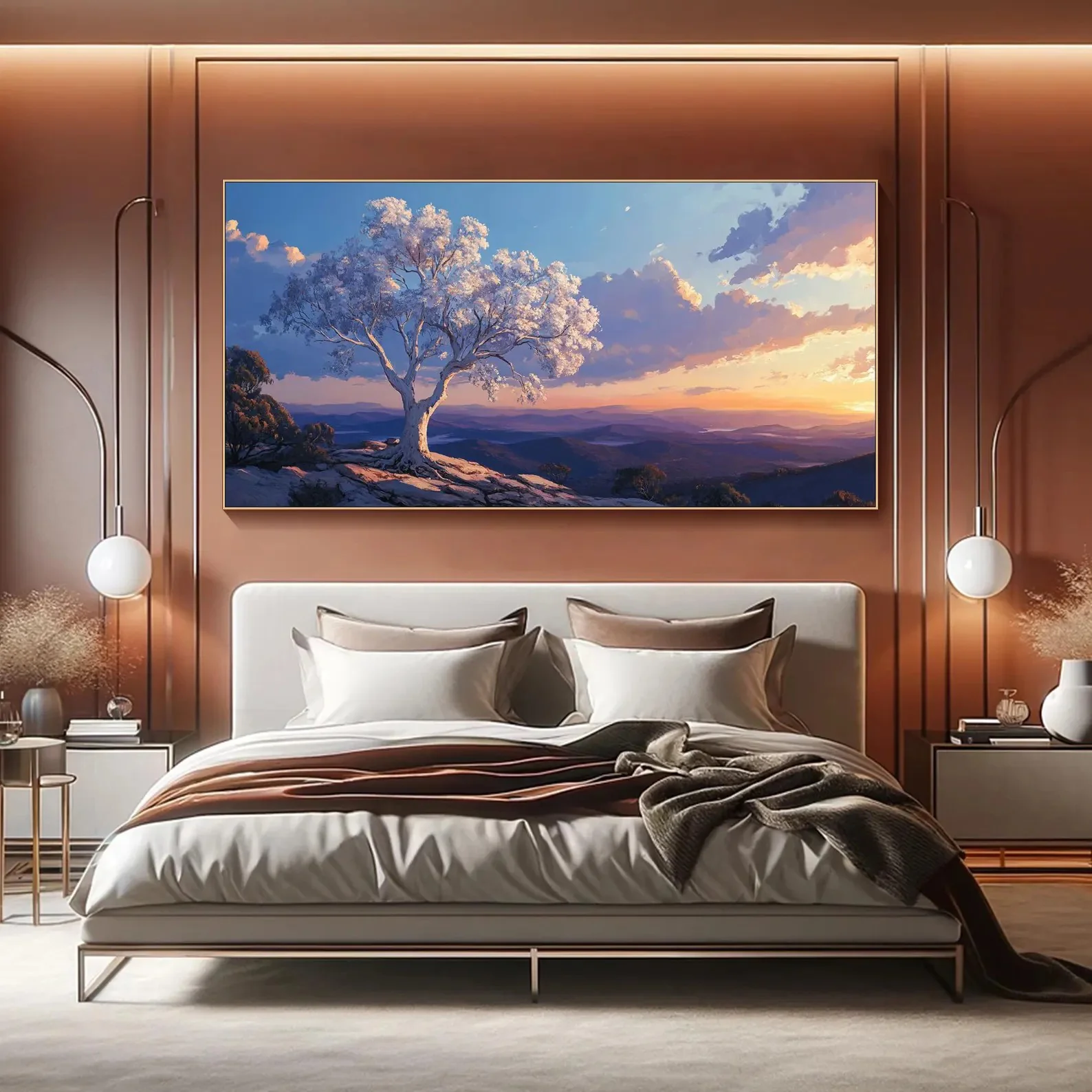 Ethereal Heights feels like standing above the world during a quiet sunset moment. A lone tree glows softly while light moves across distant hills. The sky feels open and gentle and the melancholic blossom blends beautifully with the sky . This painting brings calm focus into your space and makes the room feel peaceful, spacious, and filled with hope.