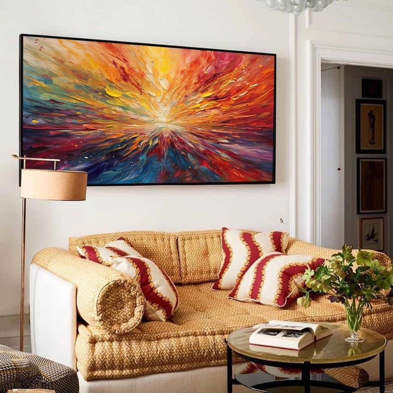 Euphoria tells a story of color, movement, and pure feeling. Every brushstroke seems to celebrate energy and light coming together. The center glows like a shared heartbeat. This artwork lifts the mood of your room and makes the space feel vibrant and welcomin