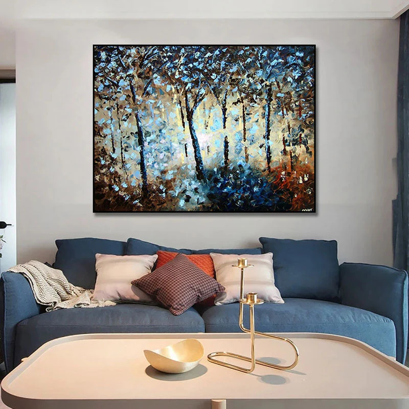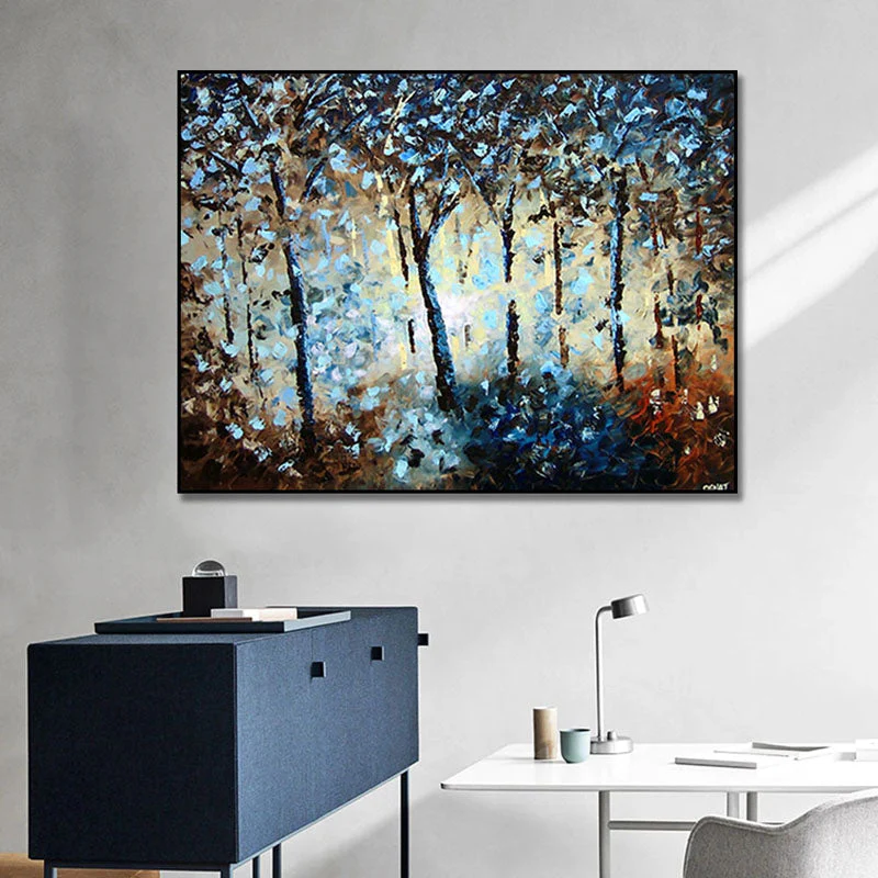 This forest feels alive! The glimmer of light filtering through the trees seems to tell untold stories. The deep blues and earthy tones create an otherworldly escape, perfect for adding a touch of quiet magic to your space.