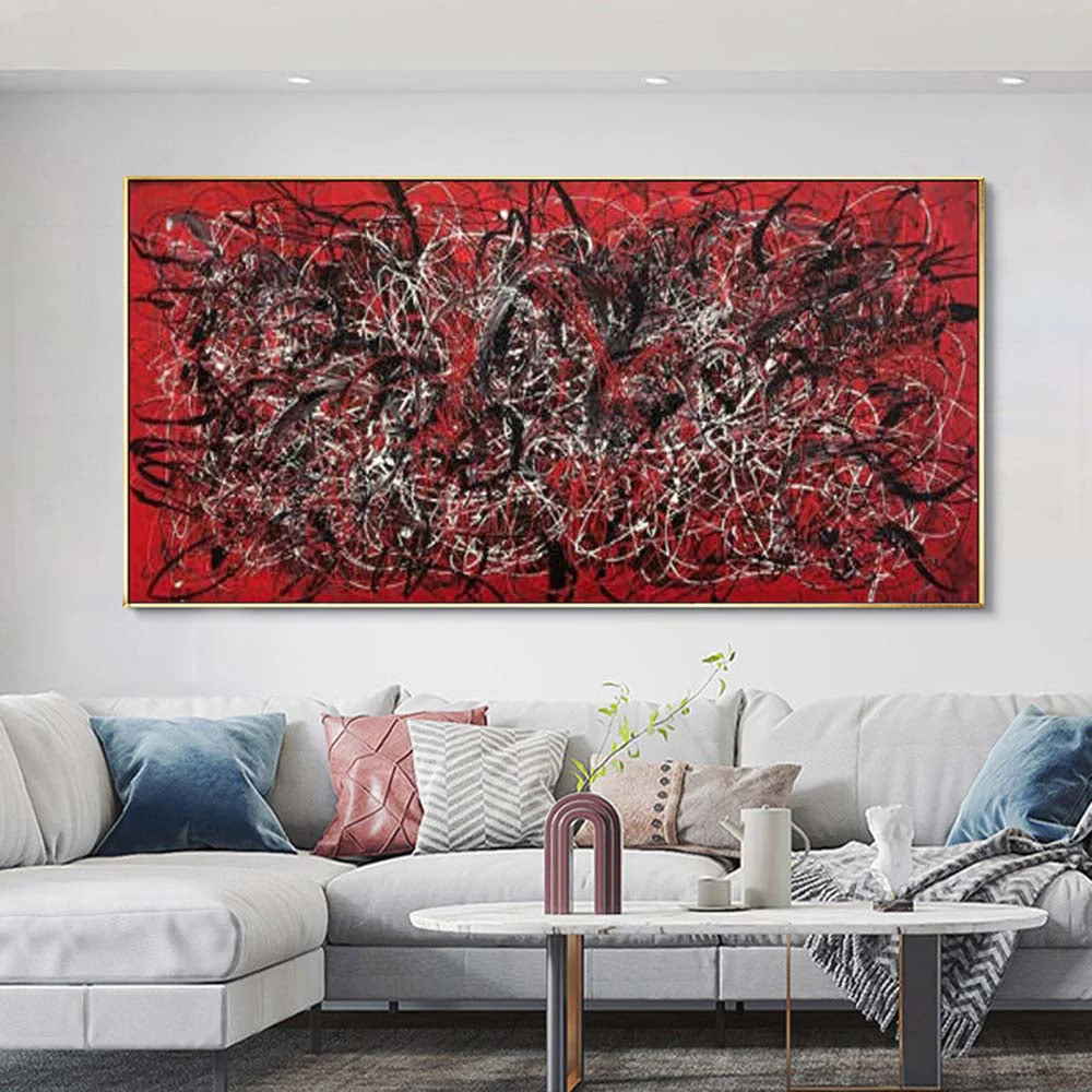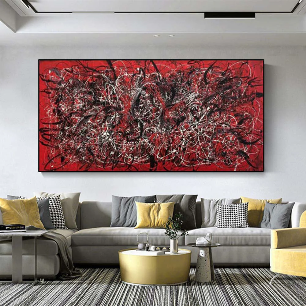 This mesmerizing artwork draws attention with its vibrant red backdrop. Dynamic black and white lines swirl and dance across the canvas, creating a captivating visual symphony that adds energy and intrigue to any space