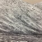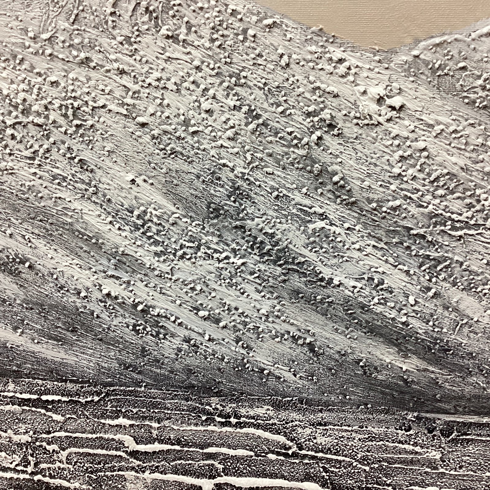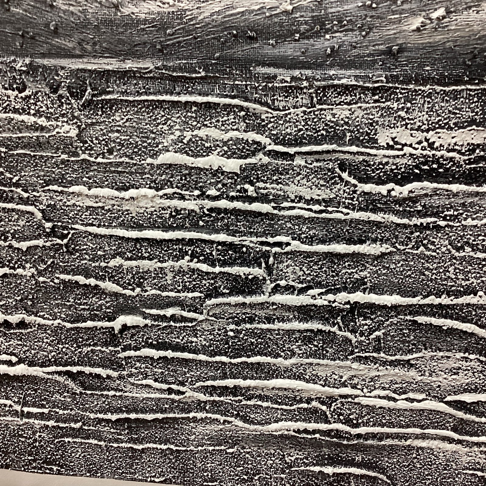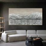 This painting features a glorious glacier in the middle of an icy ocean. The cold composition is mostly black and white, with a few bright spots of color. Because of the beautiful details, you can almost feel the cold wind blowing in your face!â�