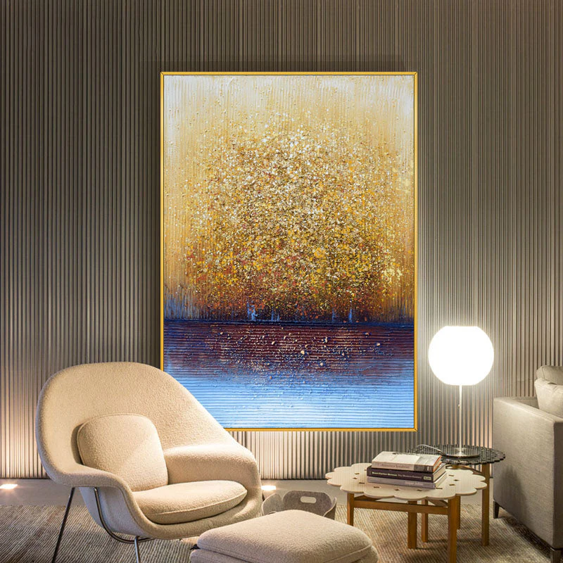 In the mighty, beautiful golden forest, you can find endless wealth and treasures, hidden away behind its many glistening trees. Are you able to find them? With a unique technique and stunning colors, this composition will enrich any home interior effortlessly!