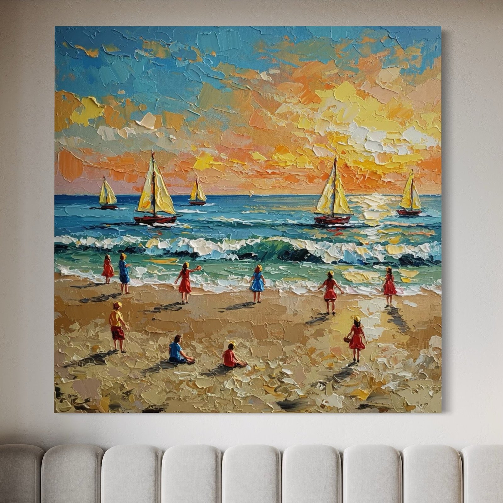 Golden Hour Play: A Vibrant Coastal Beach Canvas Painting