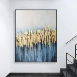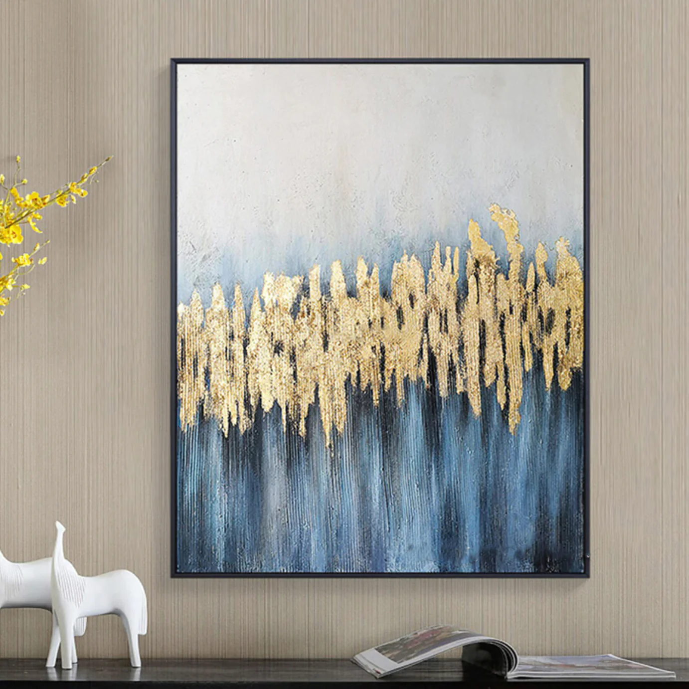 Like beautiful, golden fields of grain, this abstract artwork stands fierce and strong. The ocean-like shade of blue contrasts beautifully with the golden strokes, creating a subtle, yet stunning artwork, suited for every home interior!
