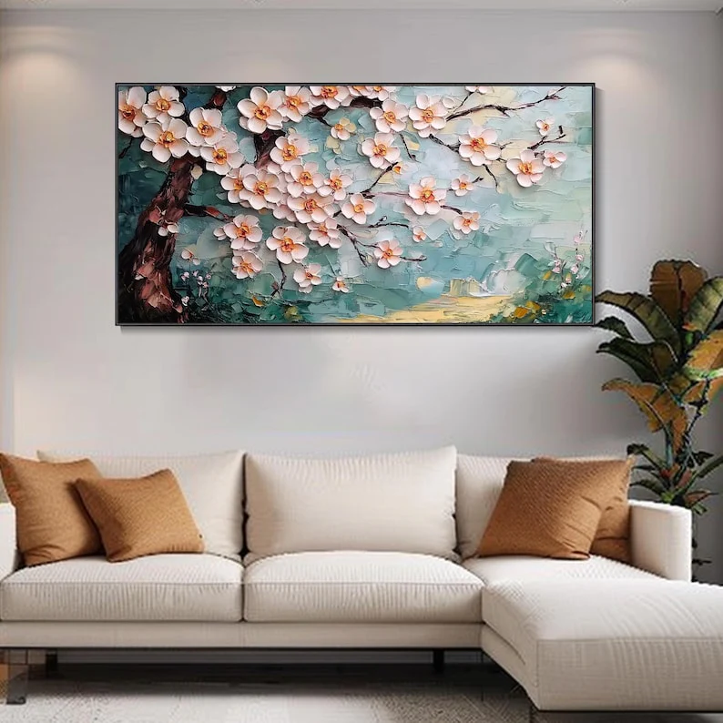In Japan, Hanami is the tradition of admiring cherry blossoms. This painting brings that moment to life. Delicate flowers reach across a soft sky, full of movement and calm. It’s a sweet escape to a peaceful place, where beauty is all around you and time stands still for a while.