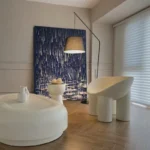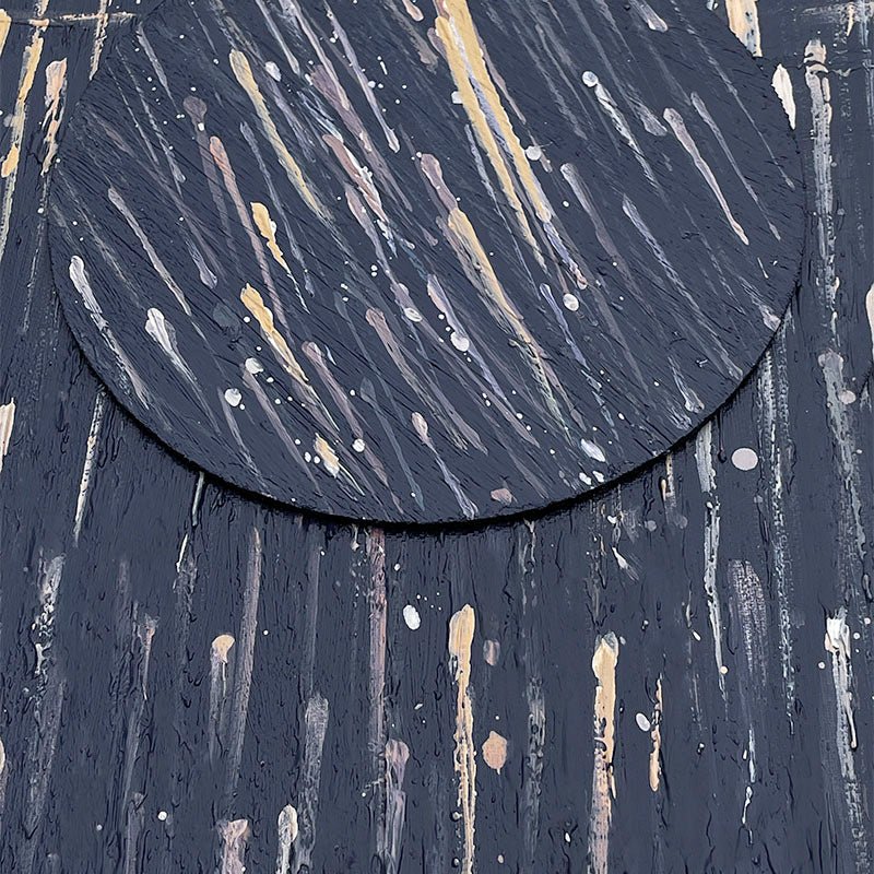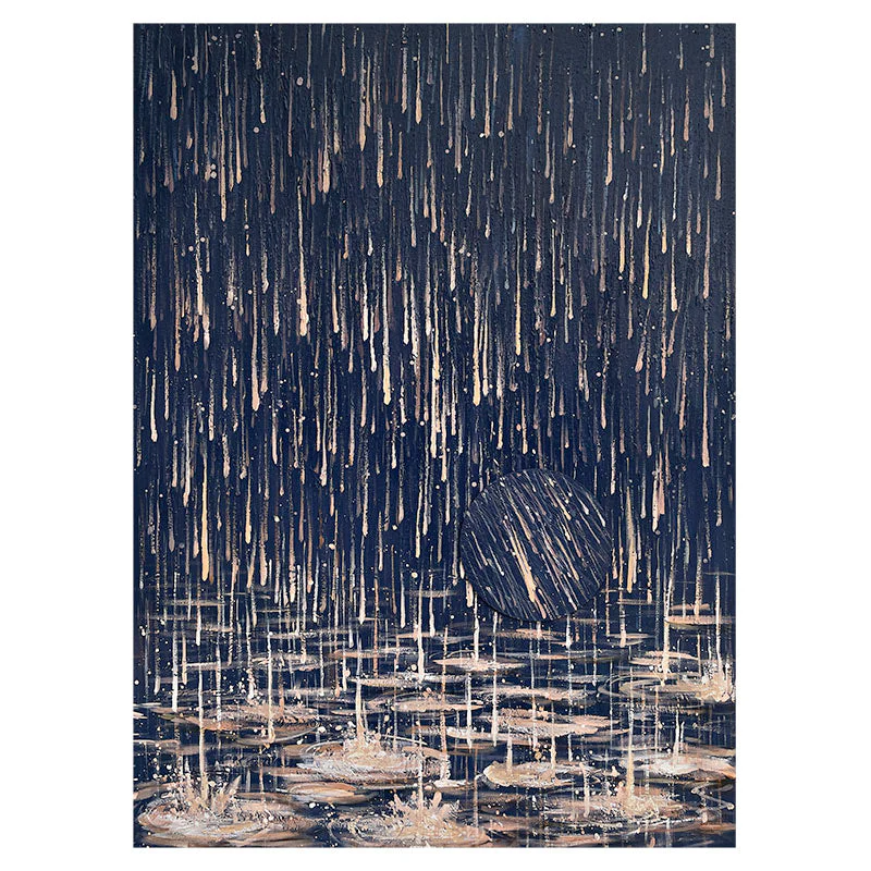 Luminated raindrops drizzle majestically from the sky, creating a remarkable, blissful sight. The light-yellow raindrops contrast beautifully with the dark, blue background. Simultaneously melancholic as beautiful, this painting will surprise you, over and over again!