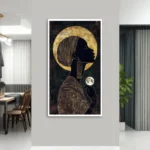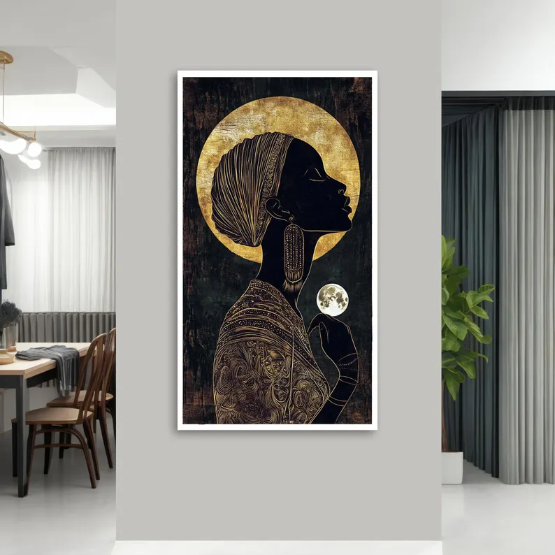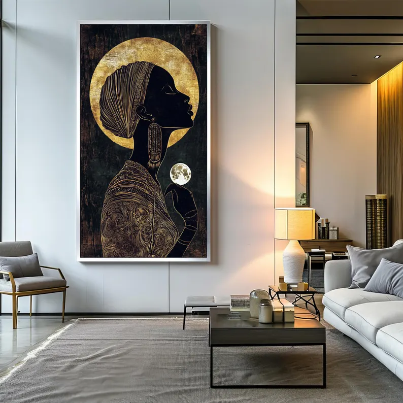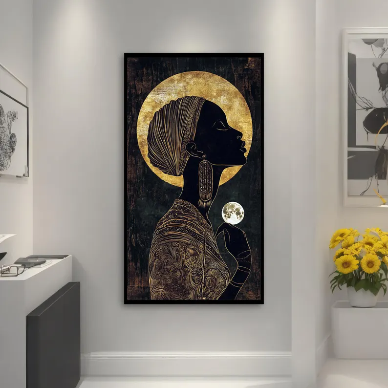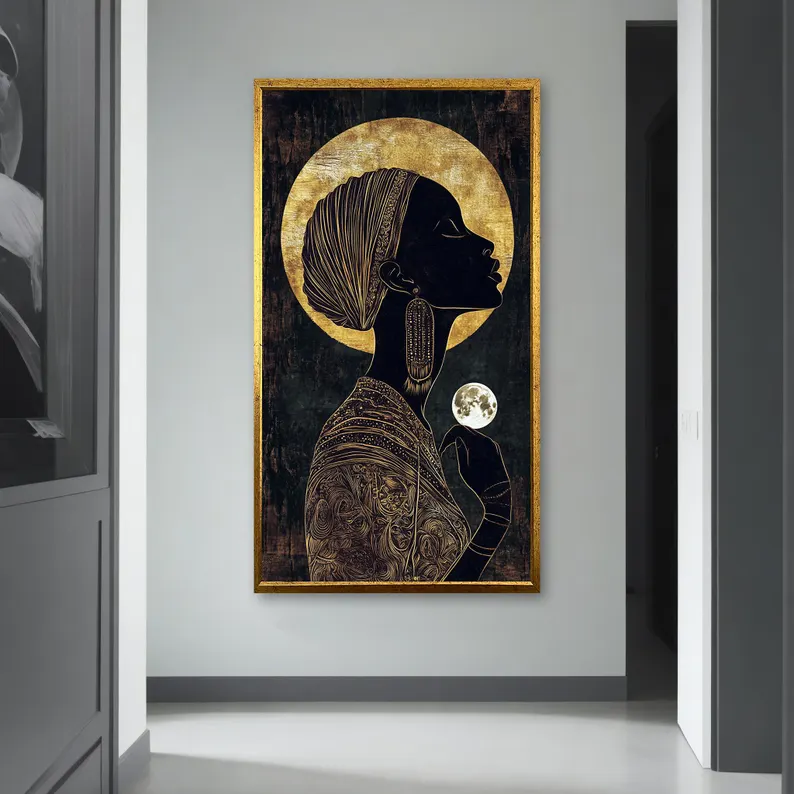 The beautiful name ‘Ifeoma’ finds its origin in Nigeria, and means goodness. This painting is a tribute to the goodness of women and their powerful connection to nature and life. With a unique painting style and many special details, this painting is a wonderful addition to any home interior!