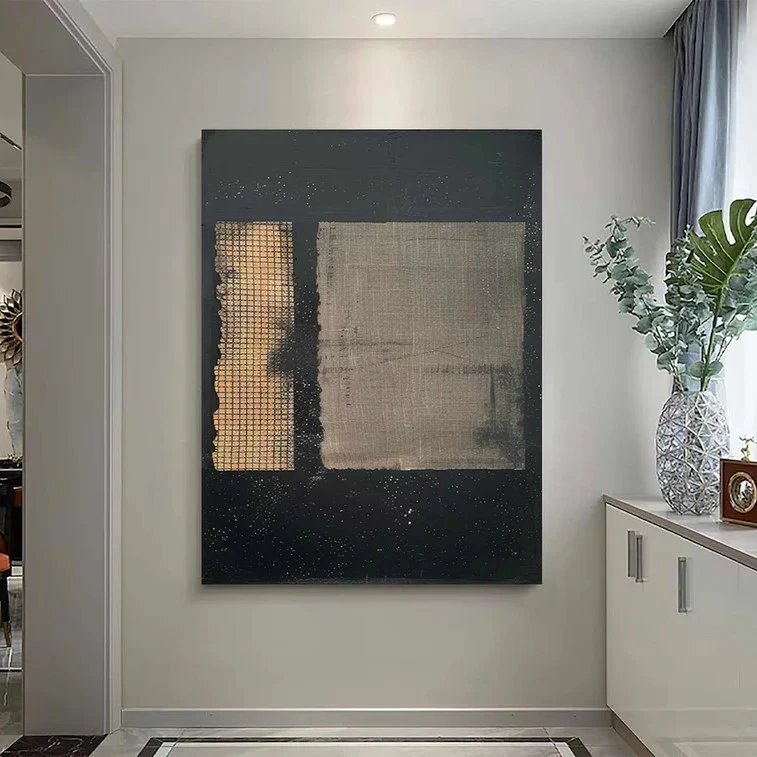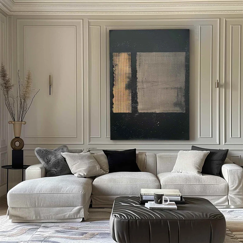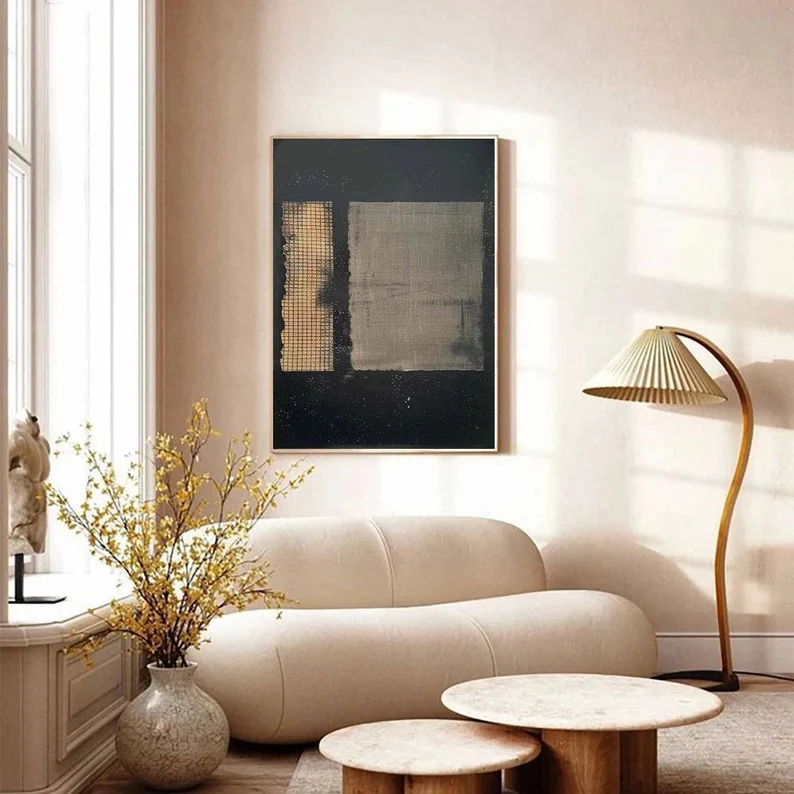 Interferences brings depth and calm into the space. Its golden tones add warmth, while the dark background grounds the room with quiet strength. Subtle textures keep it modern yet timeless, creating a balanced atmosphere that feels both elegant and serene.