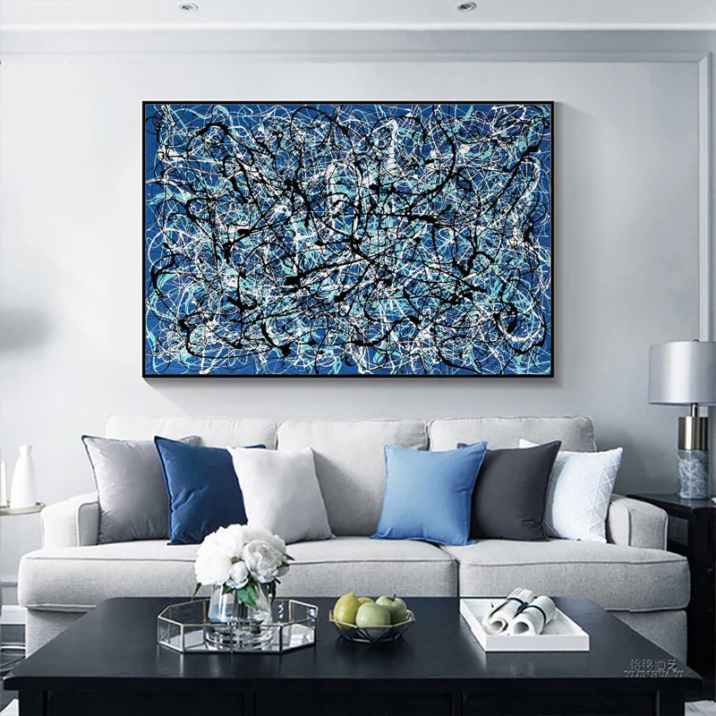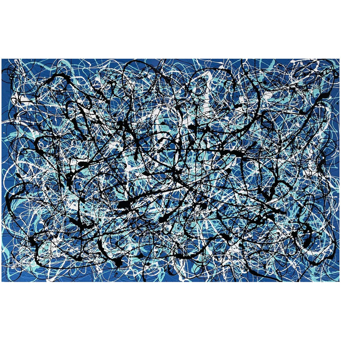 Within the captivating canvas of ‘Lost’, a beautiful blue background embraces a unique choreography. Vivid white and black lines dance along the dynamic composition, evoking a sense of wonder, as if walking through the labyrinth of the unknown.