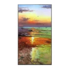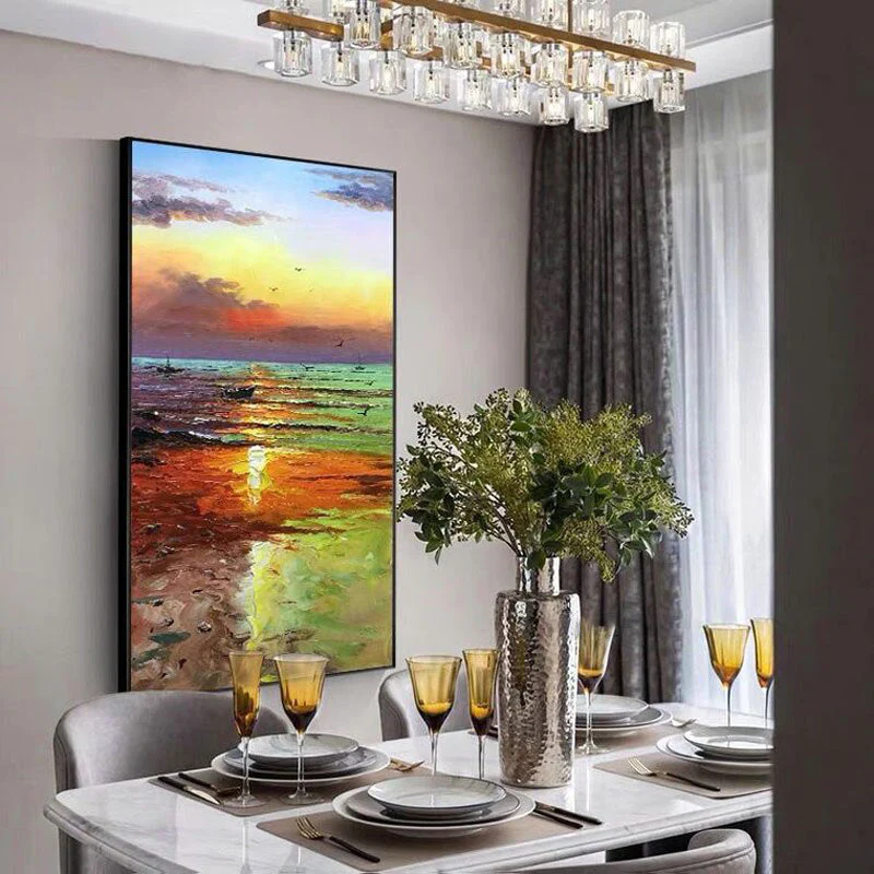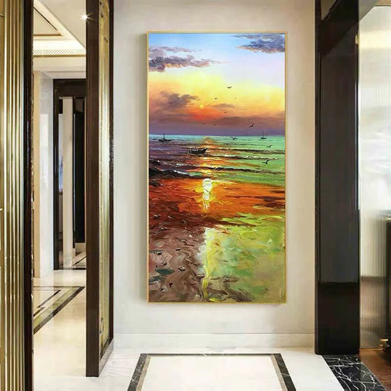 Immerse yourself in the glowing beauty of Lucid Sunset. With its radiant tones and reflective waters, this painting captures the essence of a peaceful horizon. It’s a perfect centerpiece for lovers of beautiful sunsets and serenity.