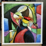 Melancholic Harmony’ is a painting with a cubist style, inspired by Pablo Picasso. The main characteristic of this work is the use of many different colors arranged in an ordered and beautifully balanced composition.