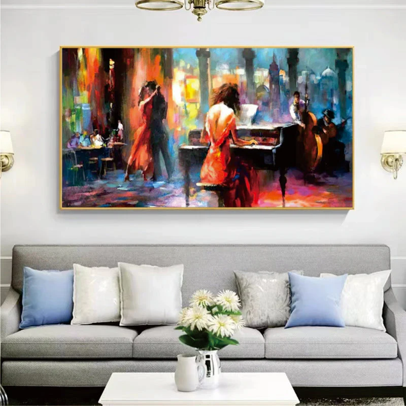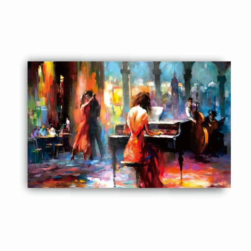 Step into the roaring 1920s with ‘Metropolitan Night.’ The impressionistic piece brings a vibrant music scene to life. A pianist, captured from behind, embodies the era’s rhythm gracefully. The canvas pulses with the ambiance of a bygone American night, alive with jazz and style.