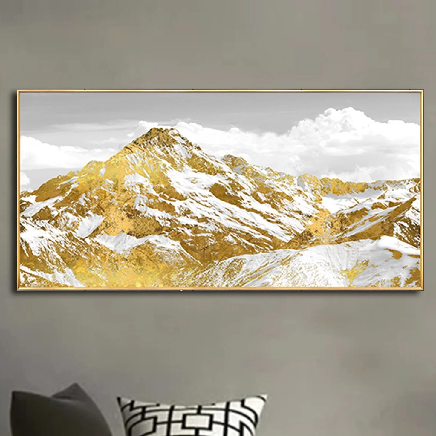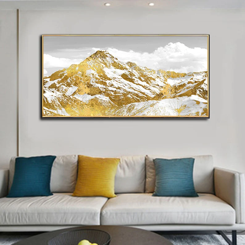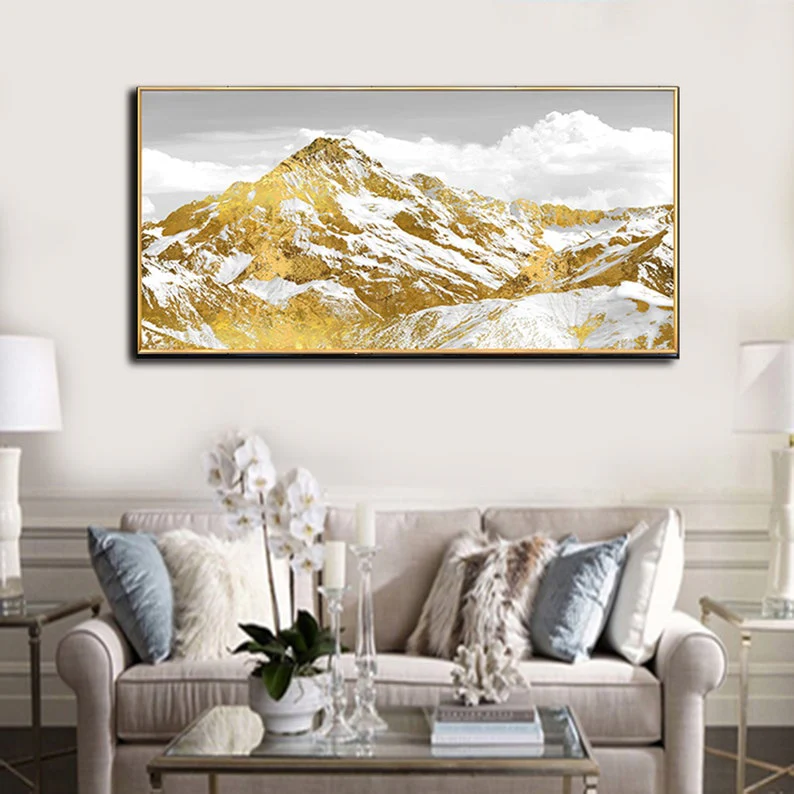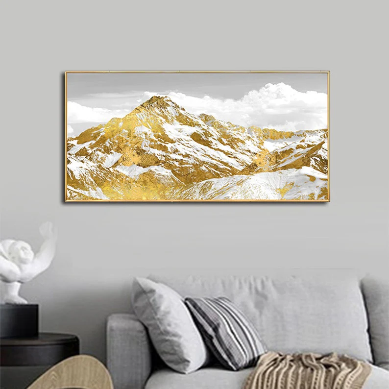 Step into a world where the mountains gleam with the richness of gold. This painting’s luxurious tones and serene landscape make it an ideal piece for those who appreciate the finer things in life, both in nature and in art.