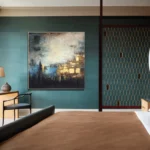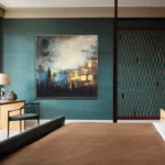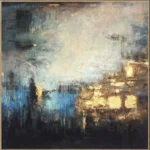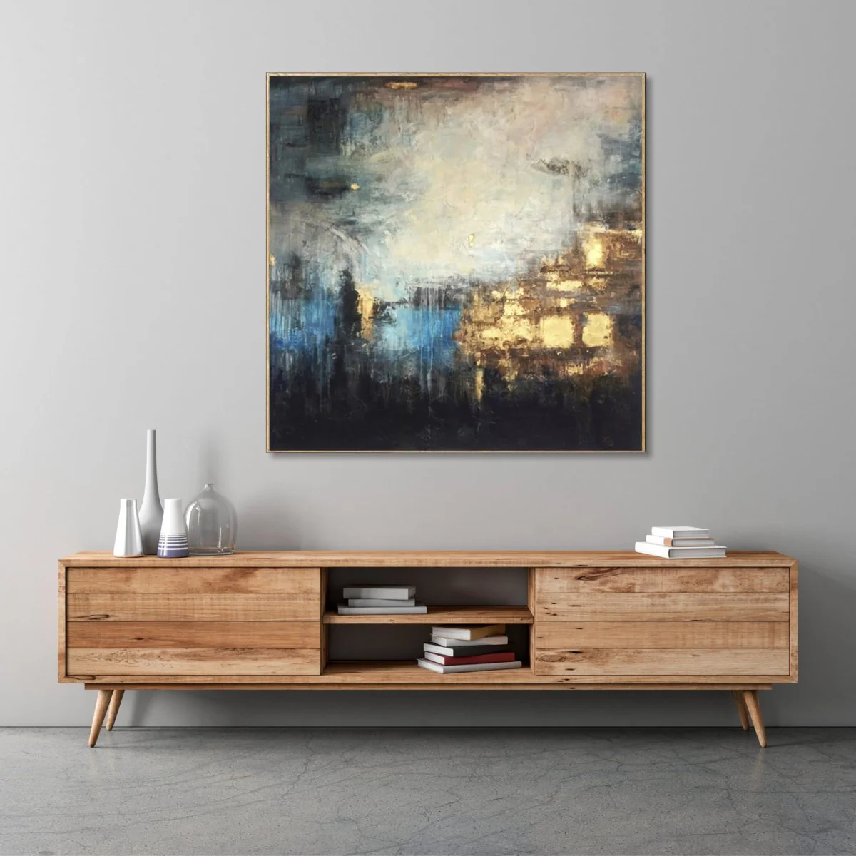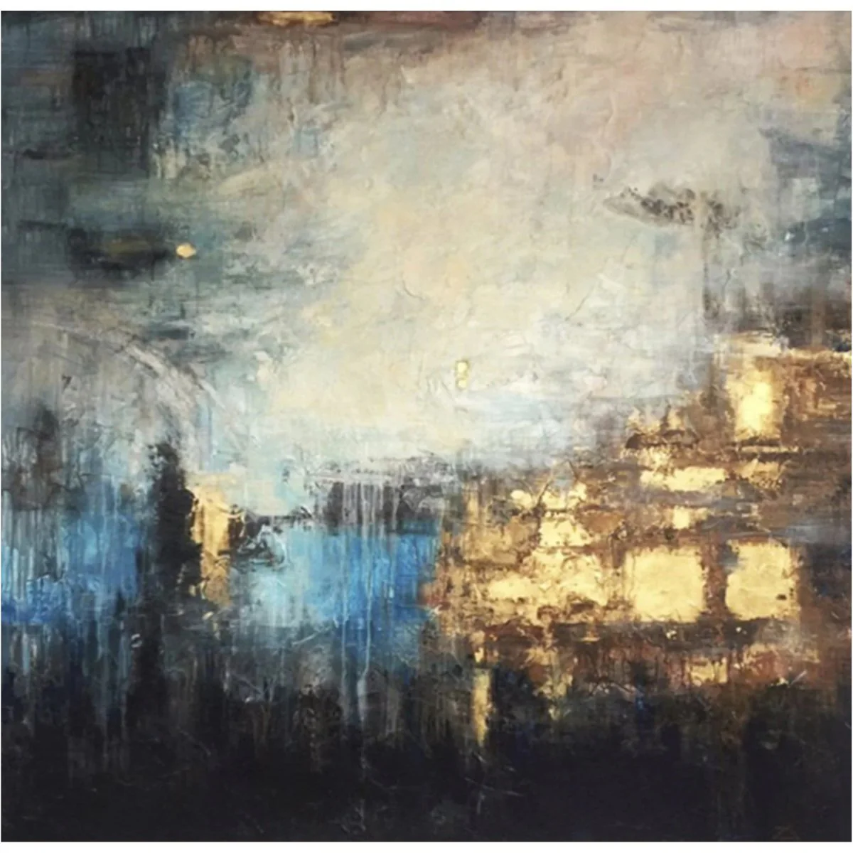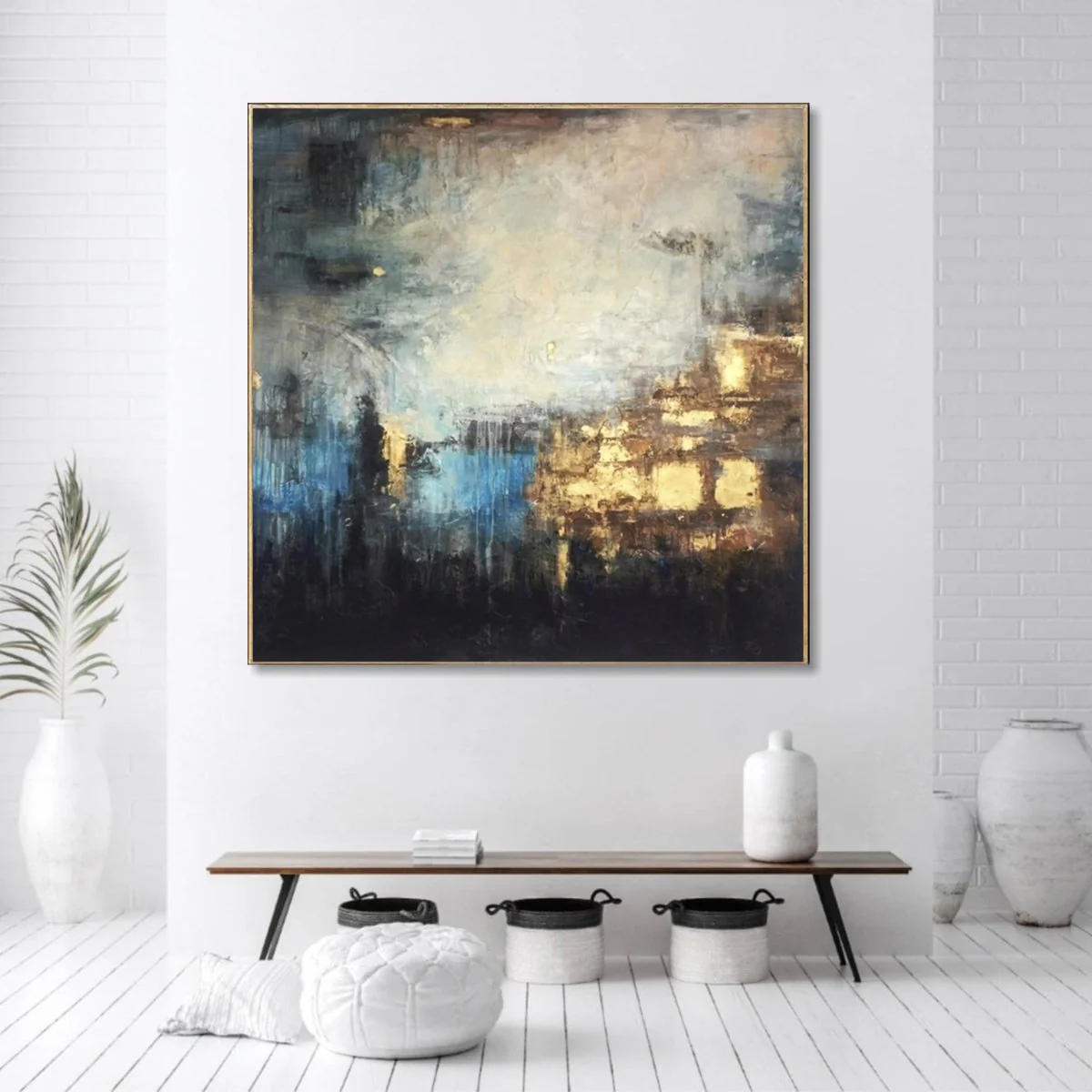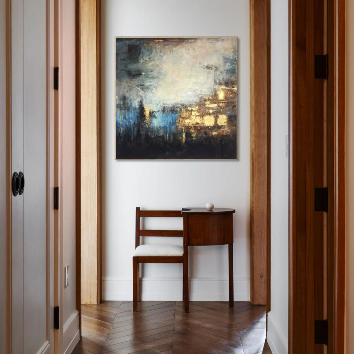 Gaze into this abstract night sky painting, where deep blues and radiant golds blend seamlessly. A soft light from above casts a melancholic mood, making this artwork a striking and elegant addition to any room, perfectly suited for any home interior.