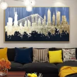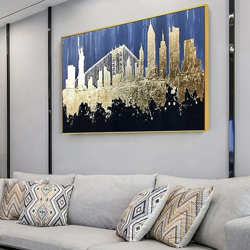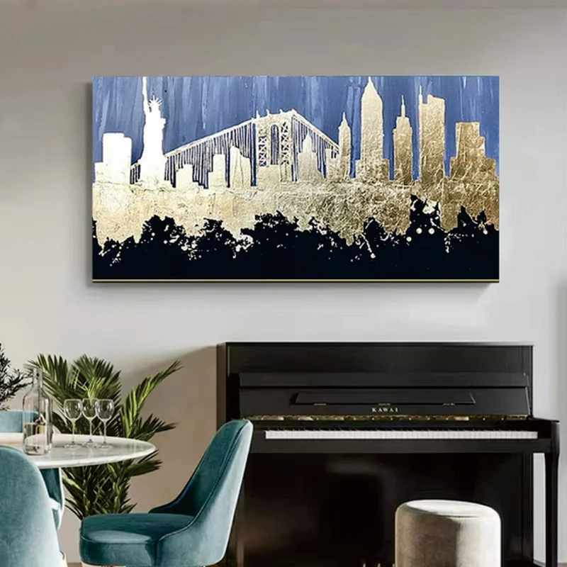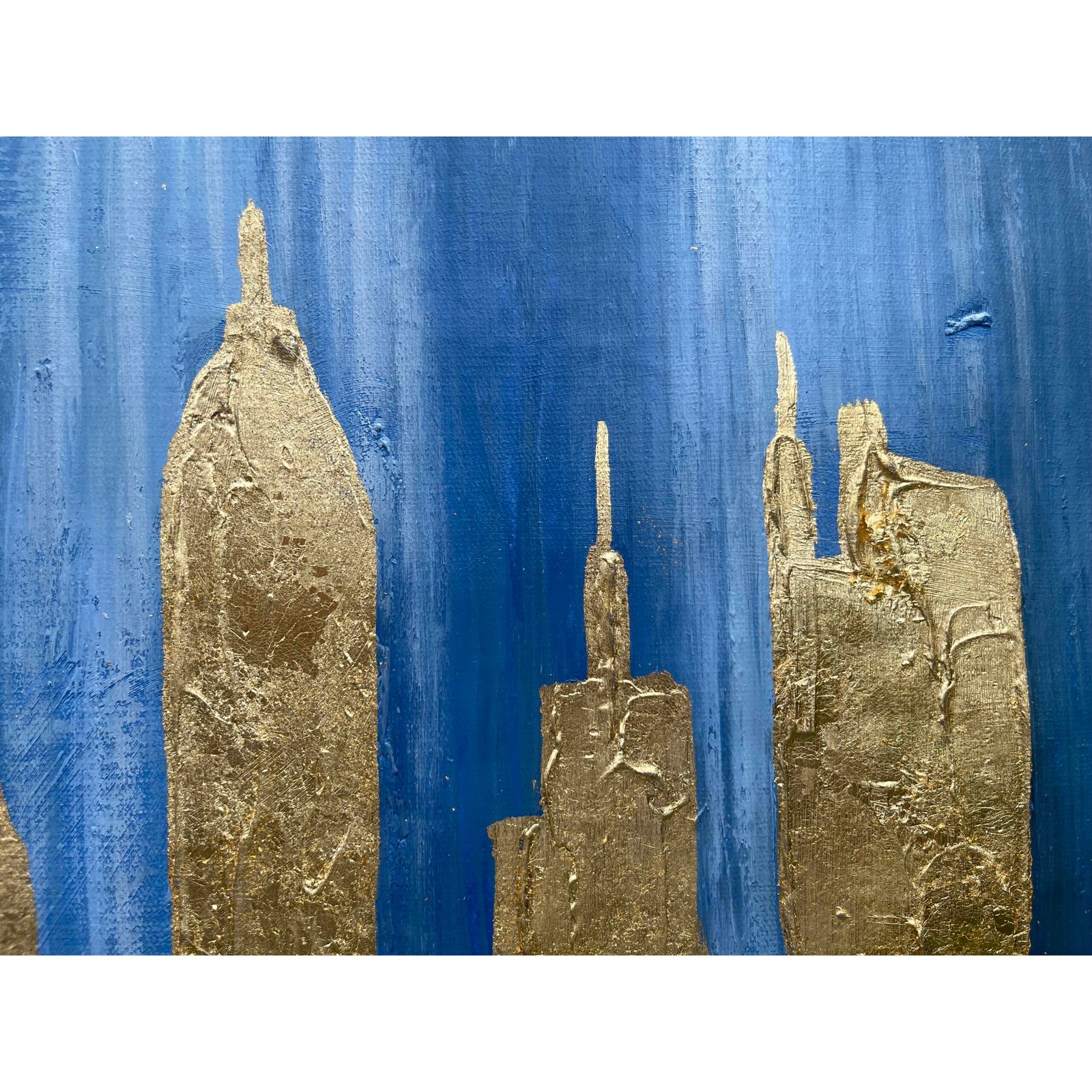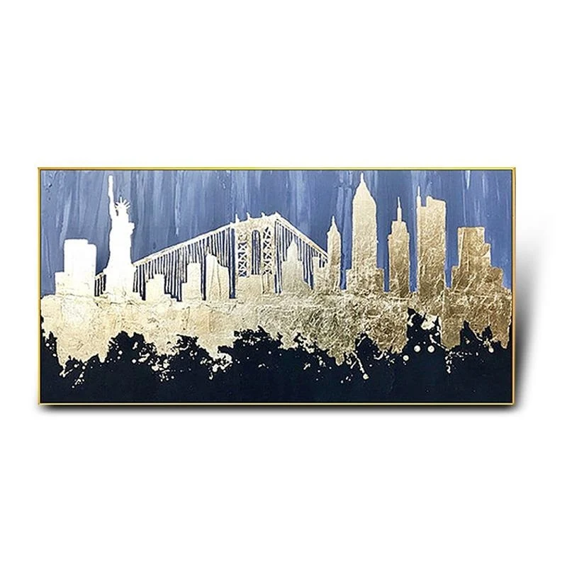 Experience the dazzle of the New York skyline. Bathed in bright gold, iconic landmarks shine with timeless allure. The artist’s strokes capture the city that never sleeps in a radiant style, making this a vibrant celebration of New York’s brilliance.