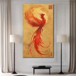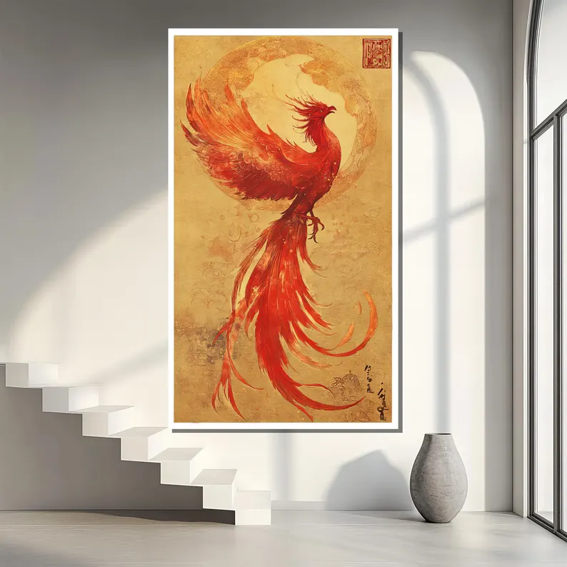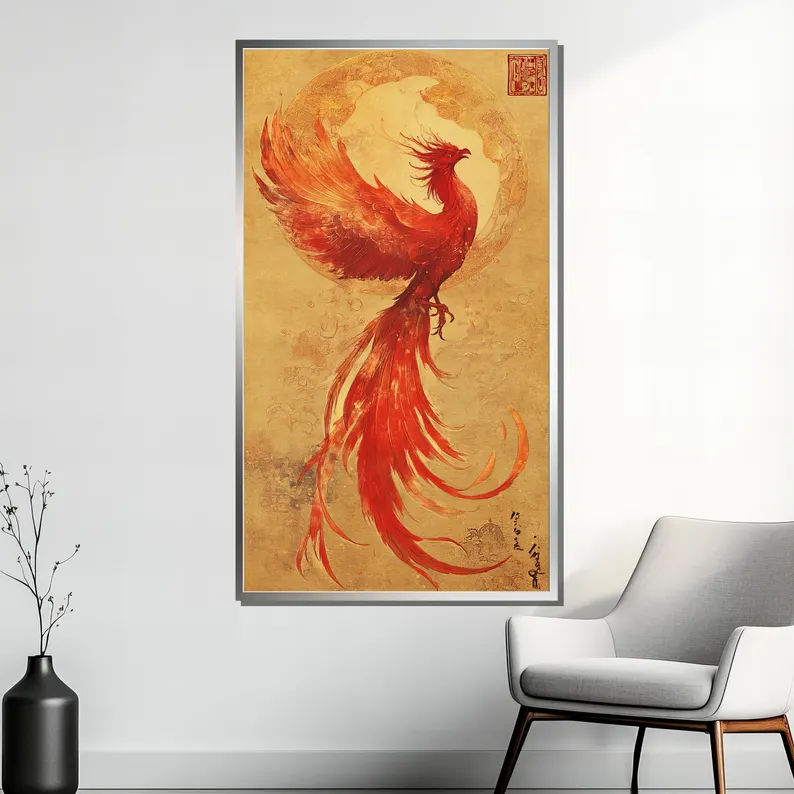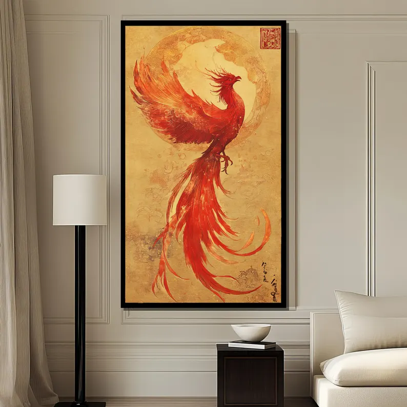 Rising again from its ashes, the phoenix spread bright wings filled with fire, flying toward a new fearless life forever. With a beautiful oriental painting style and vivid colors, this piece really brings the Phoenix (back) to life!